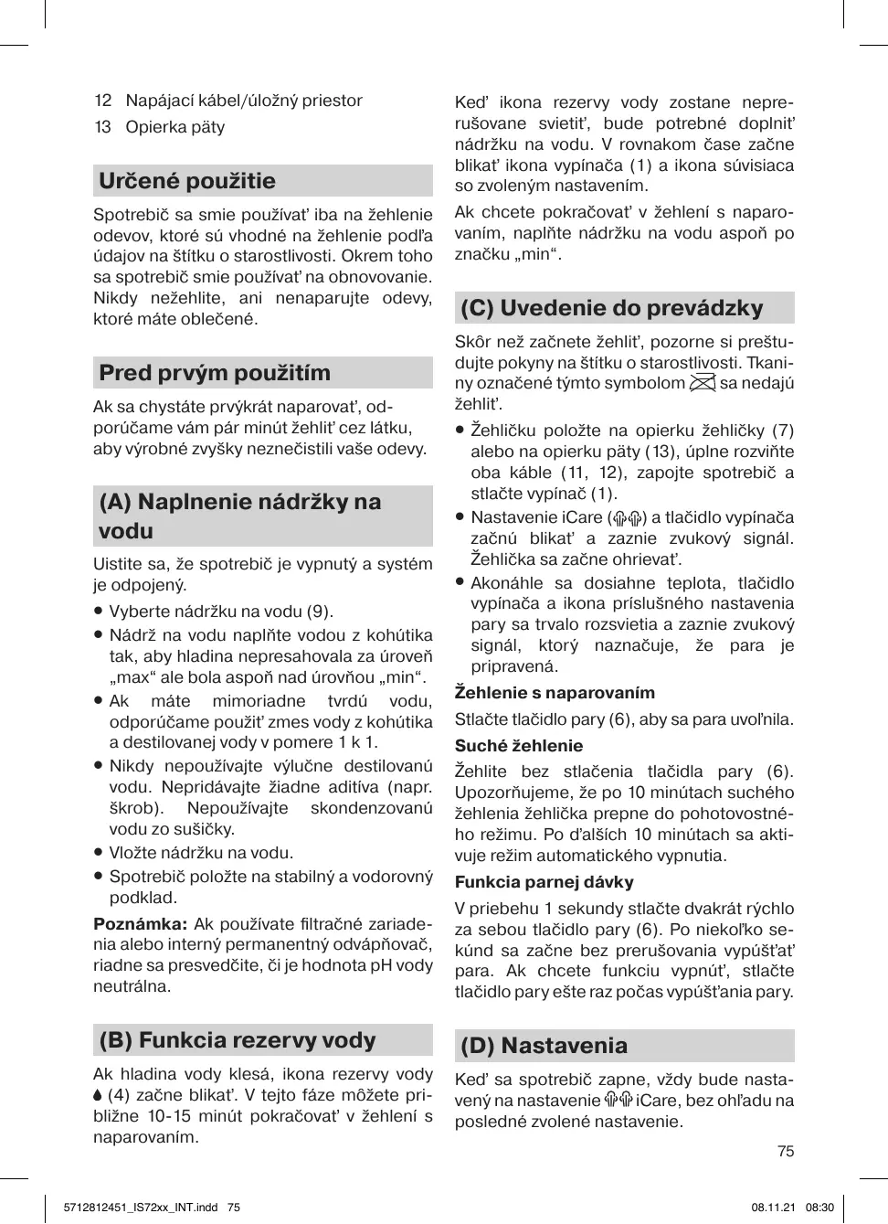 ehličku položte na opierku žehličky (7) Ž alebo na opierku päty (13), úplne rozviňte oba káble (11, 12), zapojte spotrebič a stlačte vypínač (1). Nastavenie iCare ( ) a tlačidlo vypínača začnú blikať a zaznie zvukový signál. Žehlička sa začne ohrievať. Akonáhle sa dosiahne teplota, tlačidlo vypínača a ikona príslušného nastavenia pary sa trvalo rozsvietia a zaznie zvukový signál, ktorý naznačuje, že para je pripravená.
