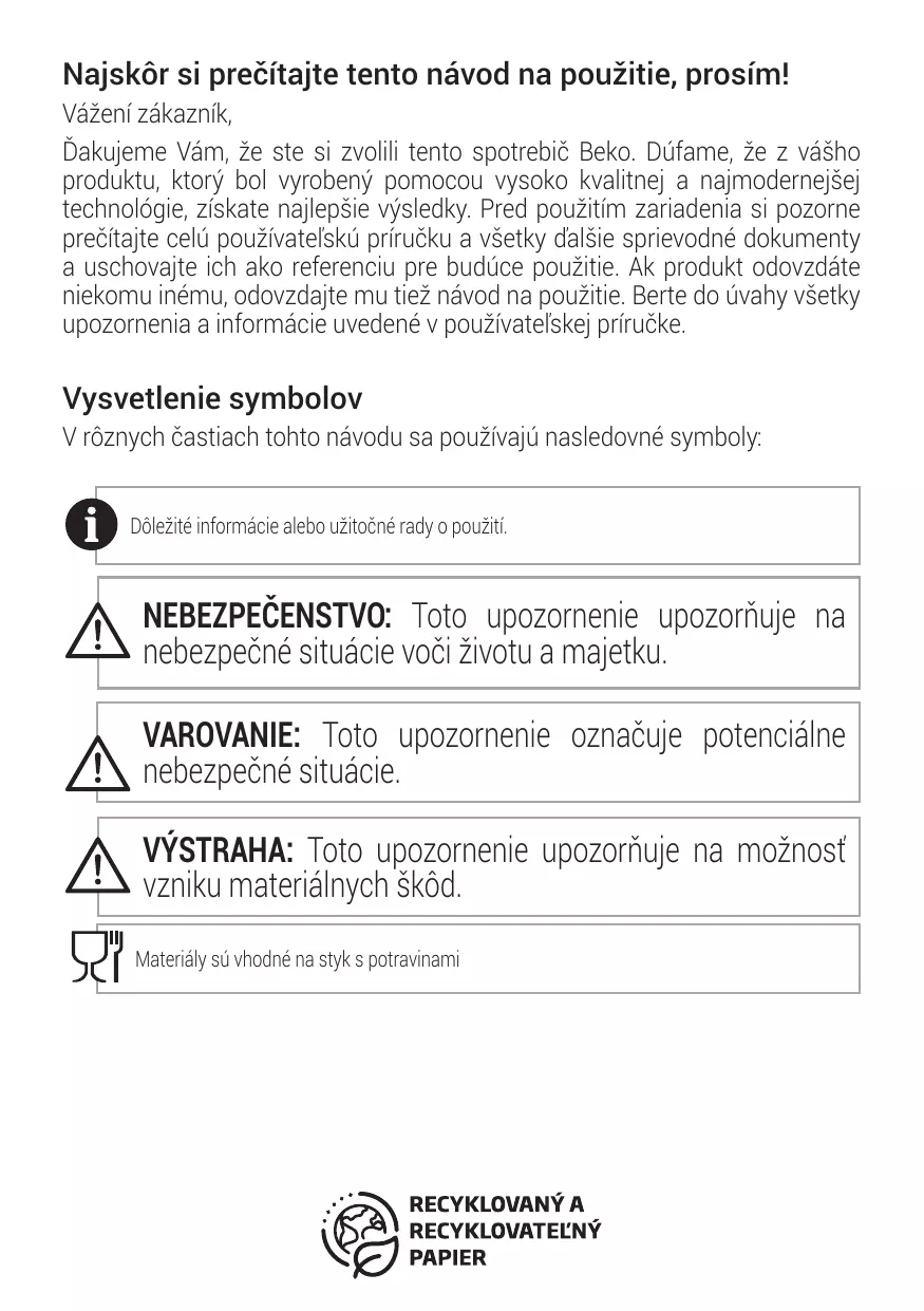149 / CZ Najskôr si prečítajte tento návod na použitie, prosím! Vážení zákazník, Ďakujeme Vám, že ste si zvolili tento spotrebič Beko. Dúfame, že z vášho produktu, ktorý bol vyrobený pomocou vysoko kvalitnej a najmodernejšej technológie, získate najlepšie výsledky. Pred použitím zariadenia si pozorne prečítajte celú používateľskú príručku a všetky ďalšie sprievodné dokumenty a uschovajte ich ako referenciu pre budúce použitie. Ak produkt odovzdáte niekomu inému, odovzdajte mu tiež návod na použitie. Berte do úvahy všetky upozornenia a informácie uvedené v používateľskej príručke.