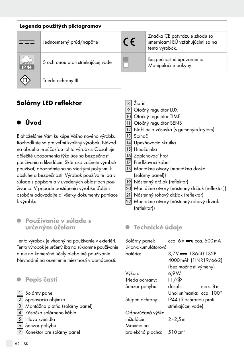 Trieda ochrany III Solárny LED reflektor Úvod Blahoželáme Vám ku kúpe Vášho nového výrobku. Rozhodli ste sa pre veľmi kvalitný výrobok. Návod na obsluhu je súčasťou tohto výrobku. Obsahuje dôležité upozornenia týkajúce sa bezpečnosti, používania a likvidácie. Skôr ako začnete výrobok používať, oboznámte sa so všetkými pokynmi k obsluhe a bezpečnosti. Výrobok používajte iba v súlade s popisom a v uvedených oblastiach používania. V prípade postúpenia výrobku ďalším osobám odovzdajte aj všetky dokumenty patriace k výrobku.