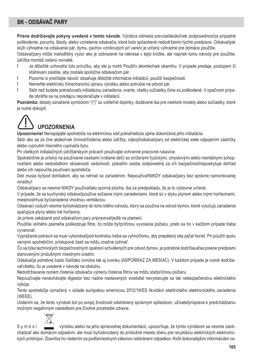 Se declina cada responsabilidad. !! Utilice un conducto cuya longitud sea la mínima indispensable. !! Utilice un conducto con el menor número posible de curvas (ángulo máximo de la curva: 90°). Il est important de conserver ce livret pour pouvoir le consulter à tout moment. En cas de vente, de cession ou de déménagement, s’assurer qu’il reste avec le produit. !! Lire attentivement les instructions: il y a d’importantes informations sur l’installation, sur l’emploi et sur la sécurité. !! Ne pas effectuer des modifications électriques ou mécaniques sur le produit ou sur les conduit d’évacuation. !! Avant d’installer l’appareil, vérifiez qu’il n’y a aucun composant endommagé. Sinon, contactez votre revendeur et ne pas continuer l’installation. Note: les pièces indiquées avec le symbole “(*)” sont des accessoires optionnels qui sont fournies uniquement avec certains modèles ou des pièces non fournies qui doivent être achetées.