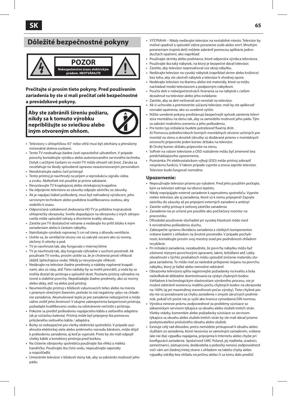 + Cette TV ne contient aucune pièce qui pourrait être réparée par l'utilisateur. En cas de défaut, contacter le fabricant ou l'agent autorisé qui assure le service après-vente. Le contact avec certaines parties stu- es à l'intérieur de la TV pourrait mettre votre vie en danger. La garantie ne couvre pas les défauts provoqués par des réparations effectuées par des tiers non autorisés.