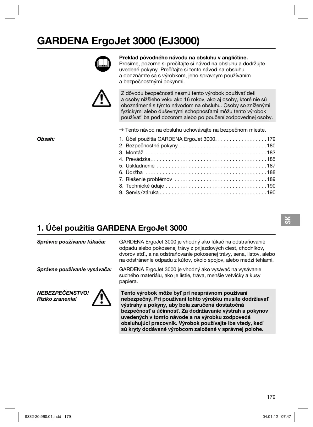 Obsah: 1. Uéel pouzitia GARDENA Ergoiet 3000... 179 2. Bezpeënostné pokyny . .180 3. Montéz . 183 4. Prevédzka.… 185 5. Uskladnenie . 187 6. Üdrba .188 7. RieSenie problémov .189 8. Technické üdaje .190 9. Servis/zäruka .…. .190