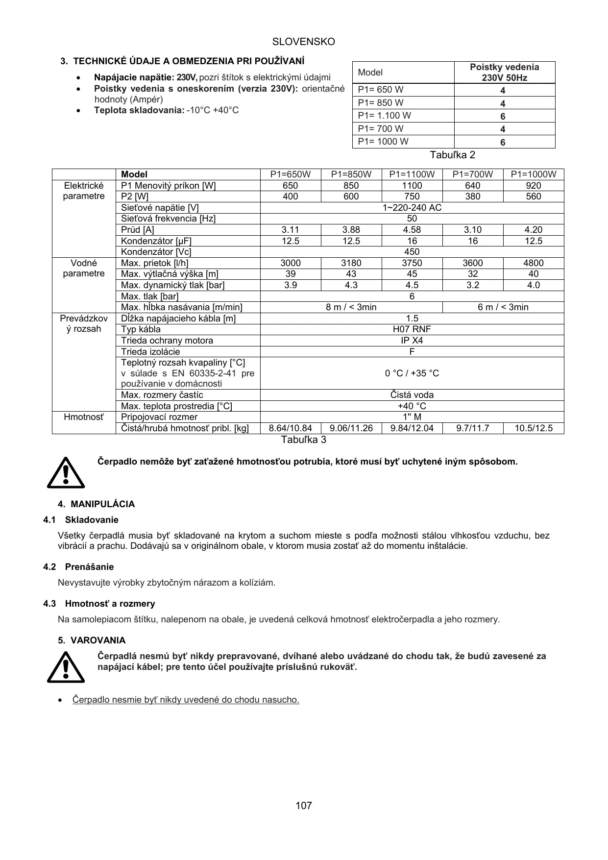 5. AVERTISSEMENTS Les pompes ne doivent jamais être transportées, soulevées ou fonctionner suspendues en utilisant le câble d'alimentation ; utiliser la poignée.