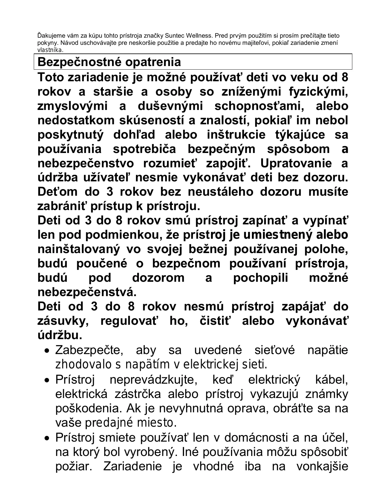 °__V pripade uplatñovania näroku vyplÿvajüceho zo zäruky prineste prosim pristroj k Väëmu predajcovi a pôvodnom obale a s dokladom o küpe. Pre aktuäine à pohodiné nahläsenie sluZby prosim navëtivte naëu webovü stränku www.suntec-wellness.de a dozviete sa viac.