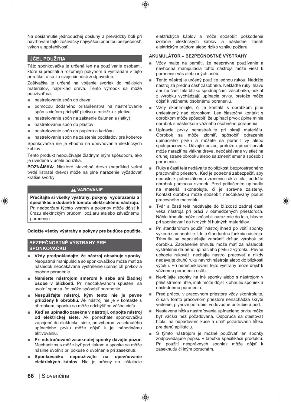 = Vädy predpokladajte, ze néstroj obsahuje sponky. Neopatnä manipuläcia so sponkovaëkou môze mat za näsledok neoëakävané vystrelenie upinacich prvkov a osobné poranenie.