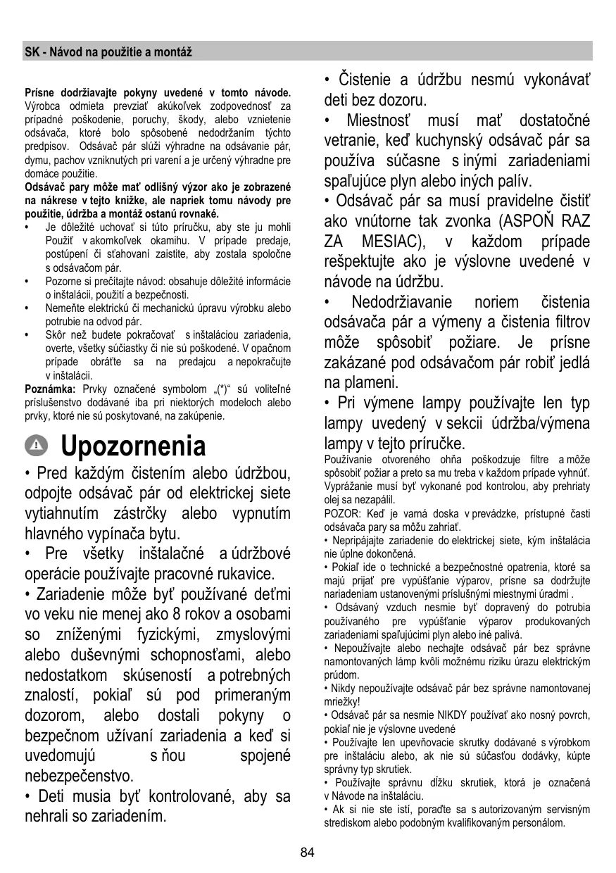 + Ne pas utiliser ou laisser la hotte sans les lampes correctement montées, car un éventuel risque de choc