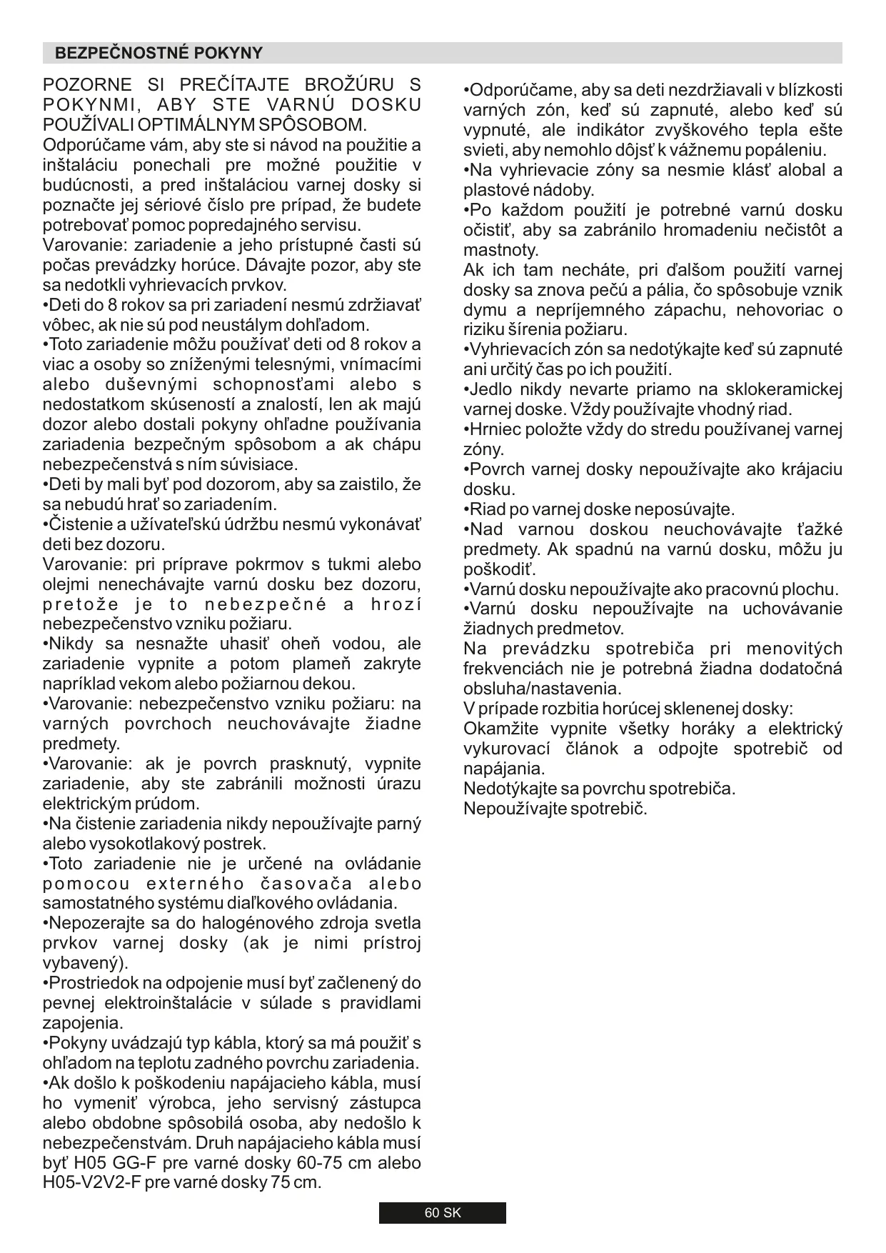 Le conducteur jaune et vert de mise à la terre ne doit pas être bloqué par le disjoncteur. La prise d'alimentation ou le disjoncteur multipolaire utilisé pour le branchement doit rester à tout moment accessible lors de l'installation de l'appareil. Le débranchement doit se faire en accédant à la prise d'alimentation ou en prévoyant un interrupteur Sur le circuit électrique fixe, conforme aux normes électriques. Si le câble d'alimentation est endommagé, il doit être remplacé par le fabricant, son agent d'entretien ou des personnes dotées du même type de qualification, afin d'éviter tout risque. Le conducteur e mise à la terre (jaune et vert) doit être plus long de 10 mm du côté de la plaque à bornes. Le diamètre interne du câble conducteur doit être proportionné à la puissance absorbée par la table de cuisson (indiquée sur l'étiquette). Le câble d'alimentation requis est le suivant : H05 GG-F pour les tables de cuisson de 60 à 75cm ou H05-V2V2-F pour les tables de 75 cm. Ne déposez jamais d'objets en métal, tels que des couteaux, fourchettes, cuüillers ou couvercles sur la table de cuisson. Ils pourraient devenir brûlants. Ne posez jamais de papier aluminium ou de récipients en plastique sur les zones chauffantes. Après chaque utilisation, il convient de nettoyer la table de cuisson, afin d'éviter l'accumulation de saleté et de graisse. Dans le cas contraire, les résidus risquent de brûler lors de la prochaine utilisation de la table de cuisson, causant fumées et odeurs déplaisantes, pour ne pas mentionner les risques d'incendie. N'utilisez jamais de vaporisateur, ni de jet à haute pression pour nettoyer l'appareil. Ne touchez pas les zones chauffantes pendant qu'elles fonctionnent, ni pendant un certain temps après leur utilisation. Ne faites jamais cuire d'aliments directement sur la table de cuisson vitrocéramique. Utilisez toujours des ustensiles de cuisson adéquats. Placez toujours votre casserole au centre du foyer que vous ütilisez. Ne déposez jamais aucun objet sur le panneau de commande. N'utilisez jamais votre table de cuisson comme plan detravail. N'utilisez pas la surface de la table de cuisson comme planche à découper. Ne rangez pas d'objets lourds sur votre table de cuisson. S'ils tombaient sur la table de cuisson, ils risqueraient de l'endommager. N'utilisez pas la table de cuisson pour ranger des objets. Ne faites pas glisser d'ustensiles de cuisine sur la table de cuisson. Aucun réglage/opération supplémentaire n'est requis pour faire fonctionner l'appareil aux fréquences nominales. Sile verre de la plaque chaude se casse : Éteignez immédiatement tous les foyers et l'élément chauffant électrique, puis isolez l'électroménager du secteur. Ne touchez pas la surface de l'électroménager. N'utilisez pas l'électroménager.