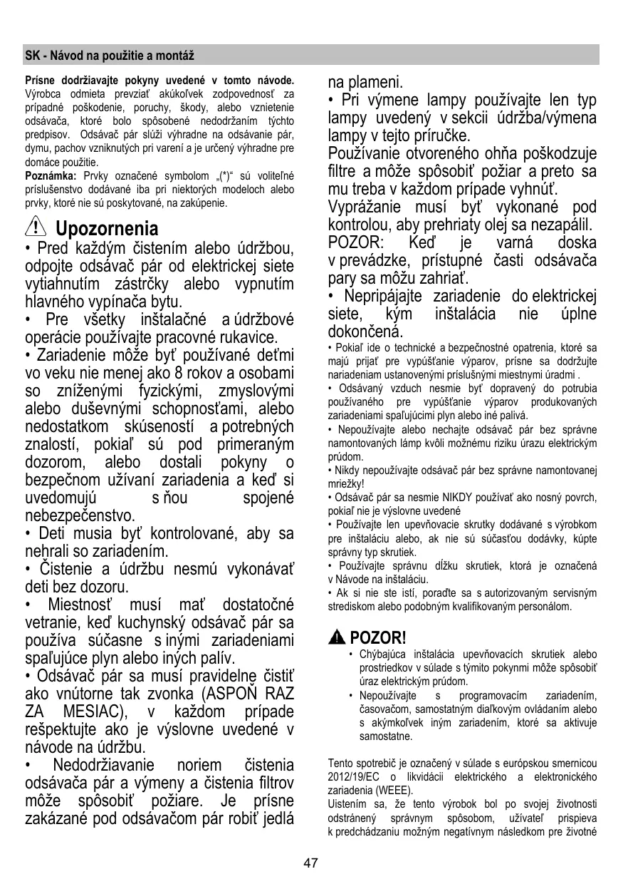 + La pièce doit avoir une aération suffisante lorsque la hotte est utilisée conjointement avec d'autres appareils fonctionnant au gaz ou autres combustibles.