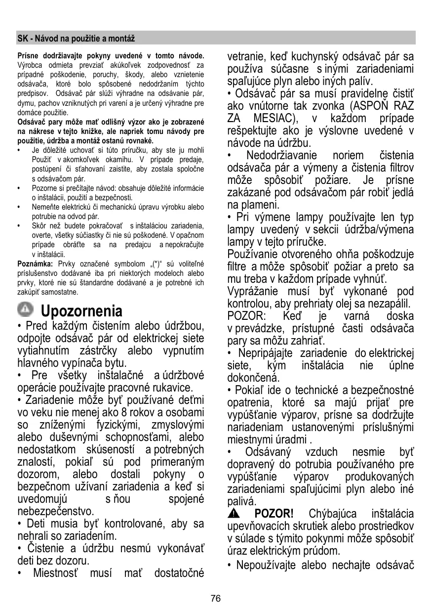 + La hotte ne doit JAMAIS être utilisée comme une surface d'appui, sauf indication expresse.