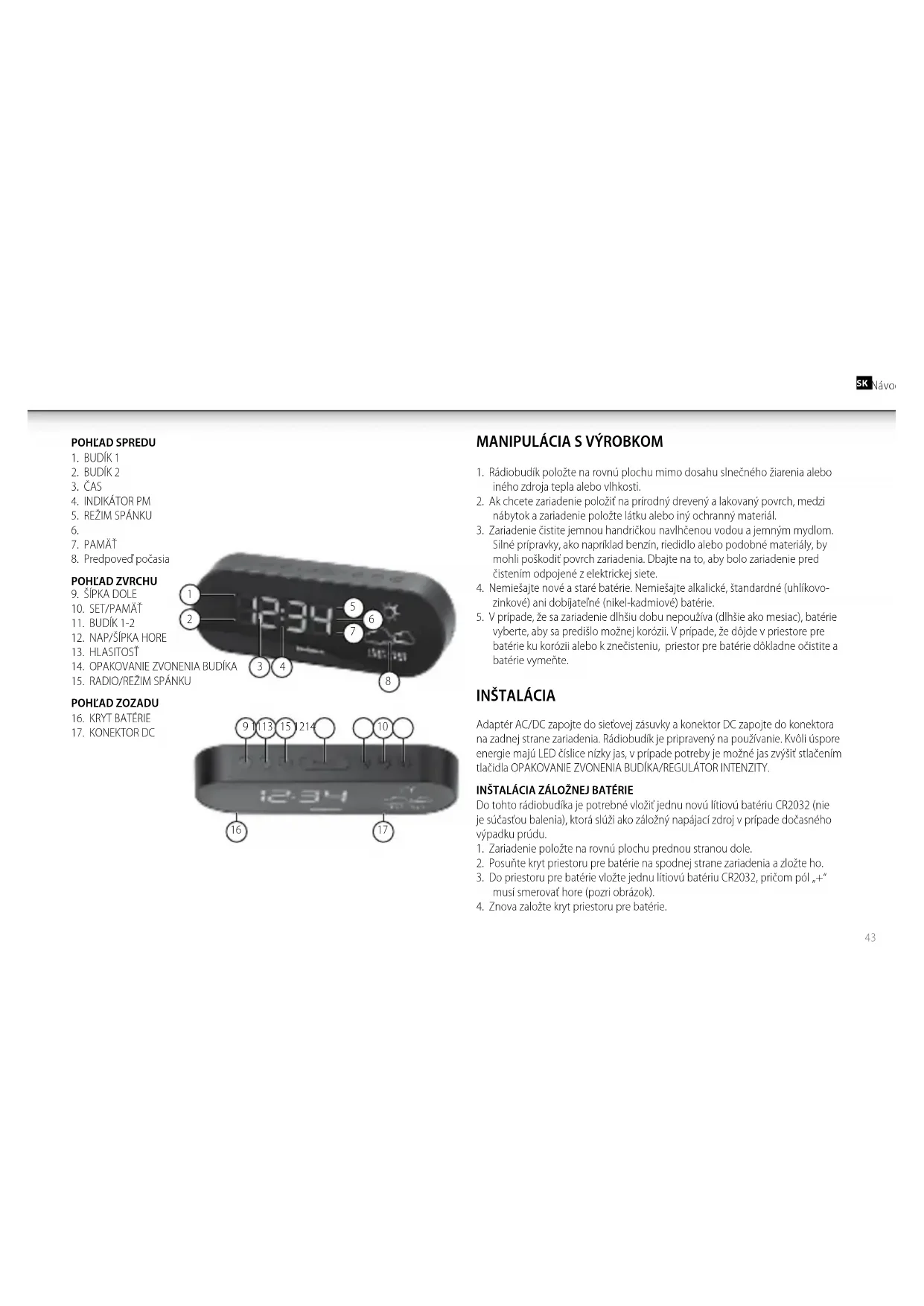 Adaptér AC/DC zapojte do sieťovej zásuvky a konektor DC zapojte do konektora na zadnej strane zariadenia. Rádiobudík je pripravený na používanie. Kvôli úspore energie majú LED číslice nízky jas, v prípade potreby je možné jas zvýšiť stlačením tlačidla OPAKOVANIE ZVONENIA BUDÍKA/REGULÁTOR INTENZITY. INŠTALÁCIA ZÁLOŽNEJ BATÉRIE Do tohto rádiobudíka je potrebné vložiť jednu novú lítiovú batériu CR2032 (nie je súčasťou balenia), ktorá slúži ako záložný napájací zdroj v prípade dočasného výpadku prúdu.