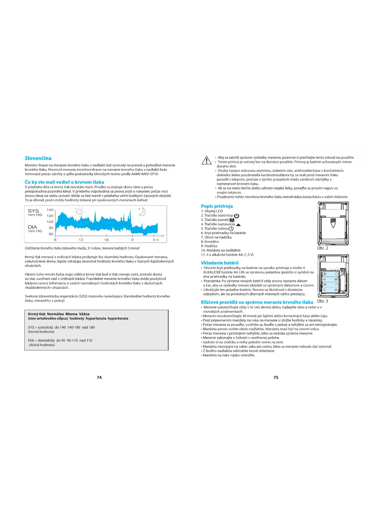 - Používanie tohto monitora krvného tlaku nenahrádza konzultáciu s vaším lekárom. Slovenčina Monitor Braun na meranie krvného tlaku v nadlaktí bol vyvinutý na presné a pohodlné meranie krvného tlaku. Presnosť merania monitora Braun na meranie krvného tlaku v nadlaktí bola testovaná počas výroby a spĺňa požiadavky klinických testov podľa AAMI/ANSI-SP10. Čo by ste mali vedieť o krvnom tlaku V priebehu dňa sa krvný tlak neustále mení. Prudko sa zvyšuje skoro ráno a počas predpoludnia pozvoľna klesá. V priebehu odpoludnia sa znova zvýši a nakoniec počas noci znovu klesá na nízku úroveň. Môže sa tiež meniť v priebehu veľmi krátkych časových období. To je dôvod, prečo môžu hodnoty získané pri opakovaných meraniach kolísať. Odčítanie krvného tlaku zdravého muža, 31 rokov, merané každých 5 minút Krvný tlak meraný v ordinácii lekára poskytuje iba okamžitú hodnotu. Opakované merania, uskutočnené doma, lepšie odrážajú skutočné hodnoty krvného tlaku v rôznych každodenných situáciách. Okrem toho mnohí ľudia majú odlišný krvný tlak keď si tlak merajú sami, pretože doma sú viac uvoľnení než v ordinácii lekára. Pravidelné meranie krvného tlaku môže poskytnúť lekárovi cennú informáciu o vašich normálnych hodnotách krvného tlaku v skutočných «každodenných» situáciách. Svetová zdravotnícka organizácia (SZO) stanovila nasledujúce štandardné hodnoty krvného tlaku, meraného v pokoji: Krvný tlak Normálne Mierna Vážna (mm ortuťového stĺpca) hodnoty hypertenzia hypertenzia SYS = systolický do 140 140-180 nad 180 (horná hodnota) DIA = diastolický do 90 90-110 nad 110 (dolná hodnota) M76