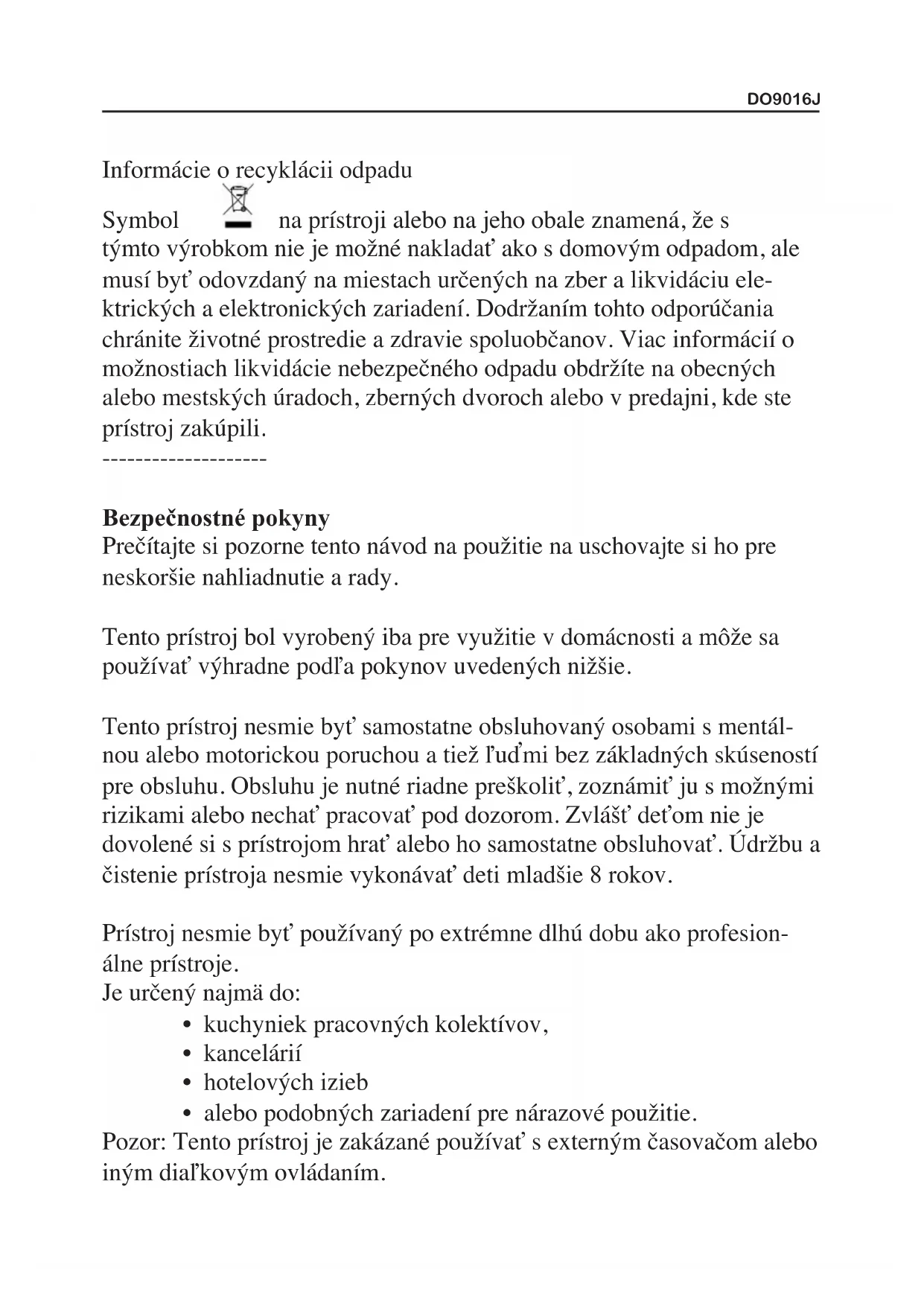 - alebo podobných zariadení pre nárazové použitie. Pozor: Tento prístroj je zakázané používať s externým časovačom alebo iným diaľkovým ovládaním.DO9016J Dodržujte bezpečnostné pokyny: