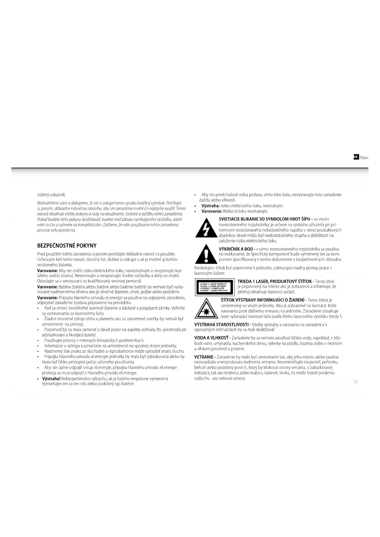 - Varovanie: Riziko el.šoku-neotvárajte. SVIETIACIE BLIKANIE SO SYMBOLOM HROT ŠÍPU - vo vnútri rovnostranného trojuholníka, je určené na výstrahu užívateľa pri prí- tomnosti neizolovaného nebezpečného napätia v rámci produktových doplnkov, ktoré môžu byť nedostatočného stupňa a dôležitosti na založenie rizika elektrického šoku. VÝKRIČNÍK A BOD - v rámci rovnostranného trojuholníka sa používa na indikovanie, že špecifický komponent bude vymenený len za kom- ponent špecifikovaný v tomto dokumente z bezpečnostných dôvodov. Nasledujúci štítok bol pripevnený k jednotke, zobrazujúci riadny postup práce s laserovým lúčom: TRIEDA 1 LASER, PRODUKTOVÝ ŠTÍTOK - Tento šítok je pripevnený na mieste ako je zobrazené a informuje, že prístroj obsahuje laserovú súčasť. ŠTÍTOK VÝSTRAHY INFORMUJÚCI O ŽIARENÍ - Tento štítok je umiestnený vo vnútri jednotky. Ako je zobrazené na ilustrácii. Kvôli varovaniu proti ďalšiemu meraniu na jednotke. Zariadenie obsahuje laser vyžarujúci laserové lúče podľa limitu laserového výrobku triedy 1. VÝSTRAHA STAROSTLIVOSTI - Všetky výstrahy a varovania na zariadení a v operačných inštrukciách by sa mali dodržiavať. VODA A VLHKOSŤ - Zariadenie by sa nemalo používať blízko vody, napríklad, v blíz- kosti vane, umývadla, kuchynského dresu, výlevky na prádlo, bazéna alebo v mokrom a vlhkom prostredí a prízemí. VETRANIE - Zariadenie by malo byť umiestnené tak, aby jeho miesto alebo pozícia nezavadzala a nevyrušovala riadnemu vetraniu. Neumiestňujte na posteľ, pohovku, behúň alebo podobný povrch, ktorý by blokoval otvory vetrania, v zabudovanej inštalácii, tak ako knižnica alebo krabica, kabinet, skriňa, čo môže brániť prúdeniu vzduchu cez vetracie otvory.