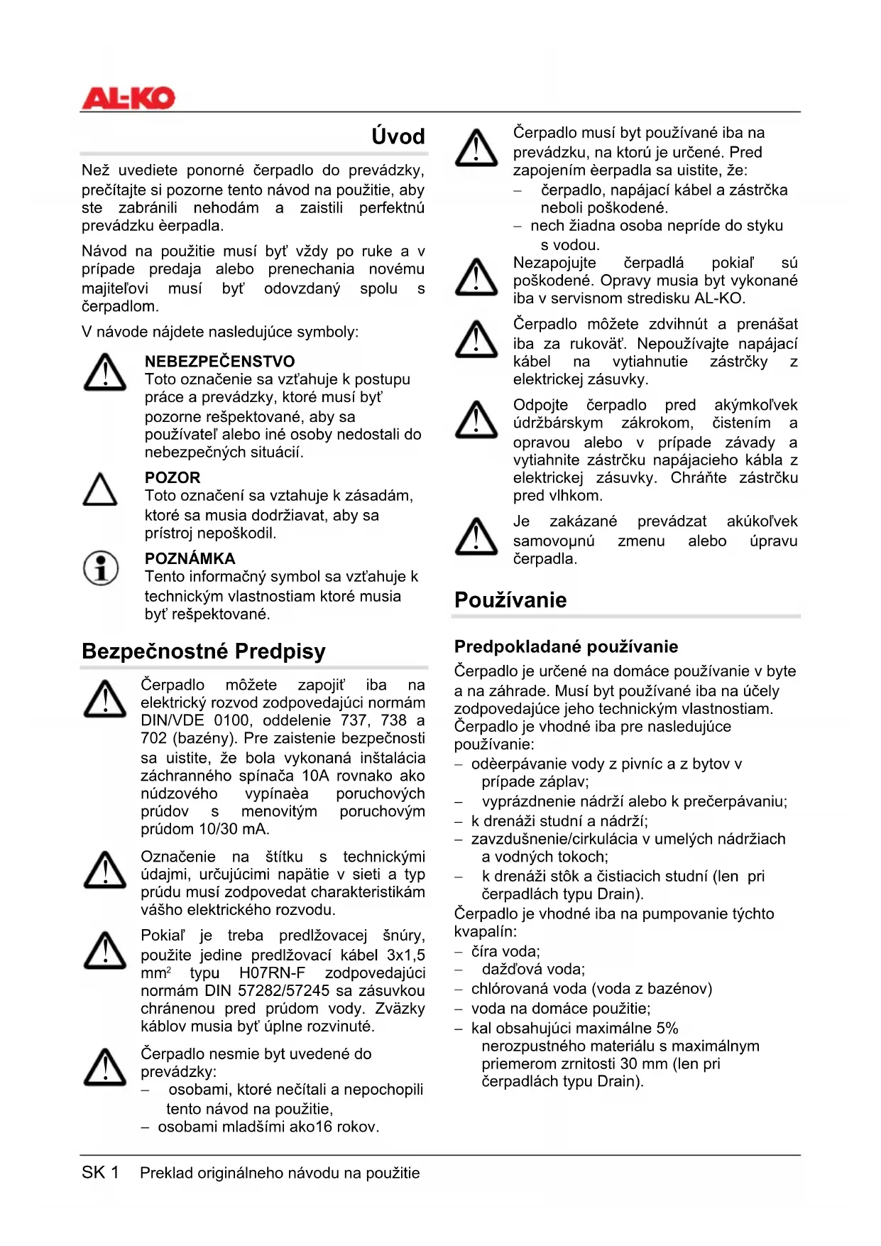 Čerpadlo nesmie byt uvedené do prevádzky: − osobami, ktoré nečítali a nepochopili tento návod na použitie, − osobami mladšími ako16 rokov. Čerpadlo musí byt používané iba na prevádzku, na ktorú je určené. Pred zapojením èerpadla sa uistite, že: − čerpadlo, napájací kábel a zástrčka neboli poškodené. − nech žiadna osoba nepríde do styku s vodou.