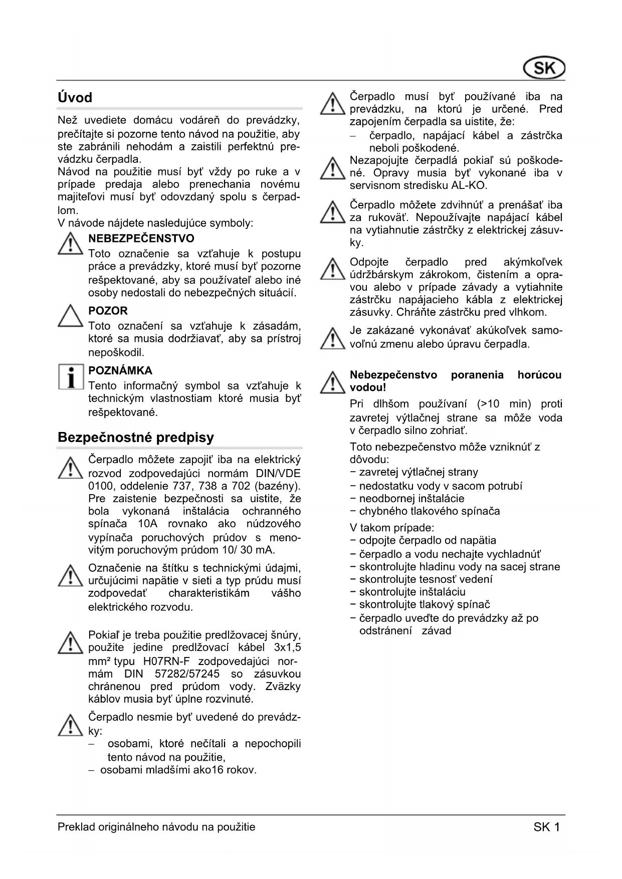 Nebezpečenstvo poranenia horúcou vodou! Pri dlhšom používaní (>10 min) proti zavretej výtlačnej strane sa môže voda v čerpadlo silno zohriať. Toto nebezpečenstvo môže vzniknúť z dôvodu: − zavretej výtlačnej strany − nedostatku vody v sacom potrubí − neodbornej inštalácie − chybného tlakového spínača V takom prípade: − odpojte čerpadlo od napätia − čerpadlo a vodu nechajte vychladnúť − skontrolujte hladinu vody na sacej strane − skontrolujte tesnosť vedení − skontrolujte inštaláciu − skontrolujte tlakový spínač − čerpadlo uveďte do prevádzky až po odstránení závad Preklad originálneho návodu na použitie SK 1Používanie SK 2 Preklad originálneho návodu na použitie Predpokladané používanie Čerpadlo je určené na domáce používanie v byte a na záhrade. Musí byť používané iba na účely zodpovedajúce jeho technickým vlastnostiam. Čerpadlo je vhodné k nasledujúcim účelom: − zavlažovanie záhrad a polí; − zásobovanie vody v domácnosti; − zvýšení tlaku pri zásobovaní vody v domác- nosti. Dejte pozor na miestne normy stano- vené pre zásobovanie. Poraďte sa s inštala- térom. Čerpadlo je vhodné iba na pumpovanie týchto kvapalín: − čistá voda; − dažďová voda. Zakázané používanie Čerpadlo nesmie byť používané na nepretržitú prevádzku. Čerpadlo nie je vhodné na pumpova- nie: − slanej vody; − tekutých potravín; − kal obsahujúci textilný alebo papierový zvyš- kový materiál; − korozívnych a chemických látok; − kyslých, zápalných, výbušných alebo prchavých kvapalín; − kvapalín teplejších ako 35˚ C; − vody s pieskom alebo brusných kvapalín. Popis čerpadla Domáca vodáreň/príslušenstvo (obrázky A a B) 1 Teleso čerpadla 2 Plniaca zátka 3 Výstupný otvor/napojenie na výtlačné potru- bie 4 Motor 5 Ventil 6 Nádrž 7 Tlakomer 8 Napájací kábel 9 Vypúšťacia zátka (priestor čerpadla) 10 Tlakový spínač 11 Ohybná trubica 12 Vypúšťacia zátka (priestor filtra) 13 Nasávací otvor/napojenie na nasávacie potrubie 14 Priehľadný kryt filtra 15 Kolenové spojenie 16 Ploché tesnenie 17 Spojovacia vsuvka 18 Kruhový tesniaci krúžok 19 Výtlačné potrubie (príslušenstvo) 20 AL-KO sacia súprava (príslušenstvo) 21 Tesnenie k filtru 22 Filter 23 Spätný ventil 24 Tesnenie 25 Kruhový tesniaci krúžok (priehľadný kryt - priestor filtra) 26 Ploché tesnenie Rozsah dodávky Domáca vodáreň je vybavená tlakovým spínačom, tlakomerom a prívodným káblom so zástrčkou zahŕňa snímač tlaku, nápojový kábel so zásuvkou Schuko. K rozsahu dodávky patrí aj kľúč filtra (pozri obrázok C). Príslušenstvo nepatrí do rozsahu dodáv- ky. Funkcia Domáca vodáreň funguje automaticky. Čerpadlo sa zapne a vypne na základe tlaku (vid' techni- cké údaje). Čerpadlo nasáva vodu prostredníctvom nasáva- cieho otvoru (13) a odvádza ju do nádrže (6). Keď dosiahne maximálneho tlaku, určujúceho zastavenie čerpadla (nádrž je plná), čerpadlo sa samo vypne. Pokiaľ sa zníži tlak a dosiahne približne 2,0 baru (vodné zásobovanie je prerušené), čerpadlo sa automaticky zapne a naplní nádrž alebo dodáva vodu do domácnosti, kde je v tom okamžiku odoberaná. V tomto prípade sa nádrž naplní až po uzavretí kohútikov v domácej sieti. Tepelná ochrana Čerpadlo je vybavené tepelným spínačom, ktorý ho vypne v prípade prehriatia. Po ochladzovaní, ktoré trvá približne 15-20 minút, sa čerpadlo automaticky zapne. Inštalácia a uvedenie do prevádzky Pred zapojením čerpadla je treba skontro- lovať tlak na vstupe membrány v čerpadle na ventile (5). Tlak musí byť približne 1,5 baru a môže byť zmenený podľa potreby (vid' Kontrola tlaku na vstupe membrány).