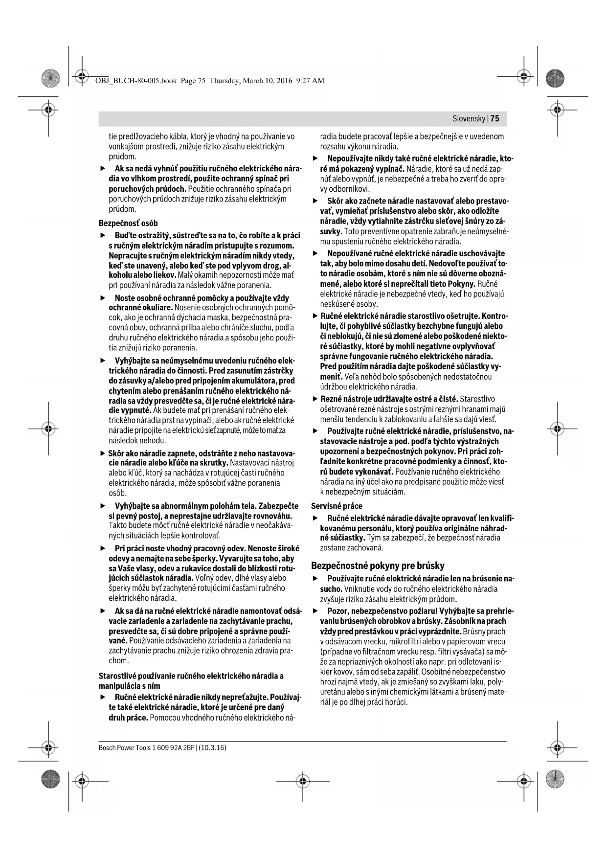 ľadnite konkrétne pracovné podmienky a činnosť, kto- rú budete vykonávať. Používanie ručného elektrického náradia na iný účel ako na predpísané použitie môže viesť k nebezpečným situáciám. Servisné práce Ručné elektrické náradie dávajte opravovať len kvalifi- kovanému personálu, ktorý používa originálne náhrad- né súčiastky. Tým sa zabezpečí, že bezpečnosť náradia zostane zachovaná. Bezpečnostné pokyny pre brúsky Používajte ručné elektrické náradie len na brúsenie na- sucho. Vniknutie vody do ručného elektrického náradia zvyšuje riziko zásahu elektrickým prúdom. Pozor, nebezpečenstvo požiaru! Vyhýbajte sa prehrie- vaniu brúsených obrobkov a brúsky. Zásobník na prach vždy pred prestávkou v práci vyprázdnite. Brúsny prach v odsávacom vrecku, mikrofiltri alebo v papierovom vrecu (prípadne vo filtračnom vrecku resp. filtri vysávača) sa mô- že za nepriaznivých okolností ako napr. pri odletovaní is- kier kovov, sám od seba zapáliť. Osobitné nebezpečenstvo hrozí najmä vtedy, ak je zmiešaný so zvyškami laku, poly- uretánu alebo s inými chemickými látkami a brúsený mate- riál je po dlhej práci horúci. OBJ_BUCH-80-005.book Page 75 Thursday, March 10, 2016 9:27 AM76 | Slovensky 1 609 92A 2BP | (10.3.16) Bosch Power Tools Pri práci držte ručné elektrické náradie pevne oboma rukami a zabezpečte si stabilný postoj. Pomocou dvoch rúk sa ručné elektrické náradie ovláda bezpečnejšie. Zabezpečte obrobok. Obrobok upnutý pomocou upína- cieho zariadenia alebo zveráka je bezpečnejší ako obrobok pridržiavaný rukou. Popis produktu a výkonu Prečítajte si všetky Výstražné upozornenia a bezpečnostné pokyny. Zanedbanie dodr- žiavania Výstražných upozornení a pokynov uvedených v nasledujúcom texte môže mať za následok zásah elektrickým prúdom, spô- sobiť požiar a/alebo ťažké poranenie. Vyklopte si láskavo vyklápaciu stranu s obrázkami produktu a nechajte si ju vyklopenú po celý čas, keď čítate tento Návod na používanie. Používanie podľa určenia Náradie je určené na brúsenie nasucho a na leštenie dreva, plastov, stierkovacej hmoty ako aj lakovaných povrchov. Vyobrazené komponenty Číslovanie jednotlivých komponentov sa vzťahuje na vyobra- zenie elektrického náradia na grafickej strane tohto Návodu na používanie. 1 Nastavovacie koliesko predvoľby frekvencie vibrácií 2 Vypínač 3 Aretačné tlačidlo vypínača 4 Kompletný zásobník na prach (Microfilter System) 5 Upínací strmienok 6 Brúsna doska 7 Brúsny list 8 Uvoľňovacie tlačidlo prednej upevňovacej lišty 9 Predná upevňovacia lišta 10 Dierkovač* 11 Skrutky pre brúsnu dosku 12 Odsávací nátrubok 13 Filtračná vložka (Microfilter System) 14 Odsávacia hadica* 15 Rukoväť (izolovaná plocha rukoväte) *Zobrazené alebo popísané príslušenstvo nepatrí celé do základ- nej výbavy produktu. Kompletné príslušenstvo nájdete v našom programe príslušenstva. Technické údaje Informácia o hlučnosti/vibráciách Hodnoty hlučnosti zistené podľa EN 60745-2-4. Hodnotená hodnota hladiny hluku A tohto náradia je typicky: Akustický tlak 80 dB(A); Hodnota hladiny akustického tlaku 91 dB(A). Nepresnosť merania K=3 dB. Používajte chrániče sluchu! Celkové hodnoty vibrácií a