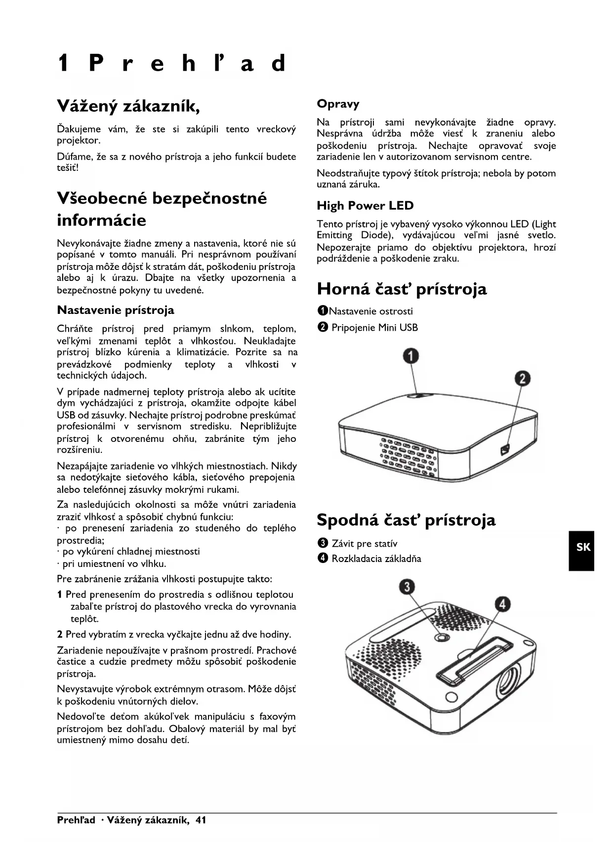 1Prehľad Vážený zákazník, Ďakujeme vám, že ste si zakúpili tento vreckový projektor. Dúfame, že sa z nového prístroja a jeho funkcií budete tešiť! Všeobecné bezpečnostné informácie Úvod 2 Nevykonávajte žiadne zmeny a nastavenia, ktoré nie sú popísané v tomto manuáli. Pri nesprávnom používaní prístroja môže dôjsť k stratám dát, poškodeniu prístroja alebo aj k úrazu. Dbajte na všetky upozornenia a bezpečnostné pokyny tu uvedené. Nastavenie prístroja Chráňte prístroj pred priamym slnkom Chráňte prístroj pred priamym slnkom, teplom, veľkými zmenami teplôt a vlhkosťou. Neukladajte prístroj blízko kúrenia a klimatizácie. Pozrite sa na prevádzkové podmienky teploty a vlhkosti v technických údajoch. V prípade nadmernej teploty prístroja alebo ak ucítite dym vychádzajúci z prístroja (USB) V prípade nadmernej teploty prístroja alebo ak ucítite dym vychádzajúci z prístroja, okamžite odpojte kábel USB od zásuvky. Nechajte prístroj podrobne preskúmať profesionálmi v servisnom stredisku. Nepribližujte prístroj k otvorenému ohňu, zabránite tým jeho rozšíreniu. Nezapájajte zariadenie vo vlhkých miestnostiach. Nezapájajte zariadenie vo vlhkých miestnostiach. Nikdy sa nedotýkajte sieťového kábla, sieťového prepojenia alebo telefónnej zásuvky mokrými rukami. Zrážanie vlhkosti Za nasledujúcich okolnosti sa môže vnútri zariadenia zraziť vlhkosť a spôsobiť chybnú funkciu: