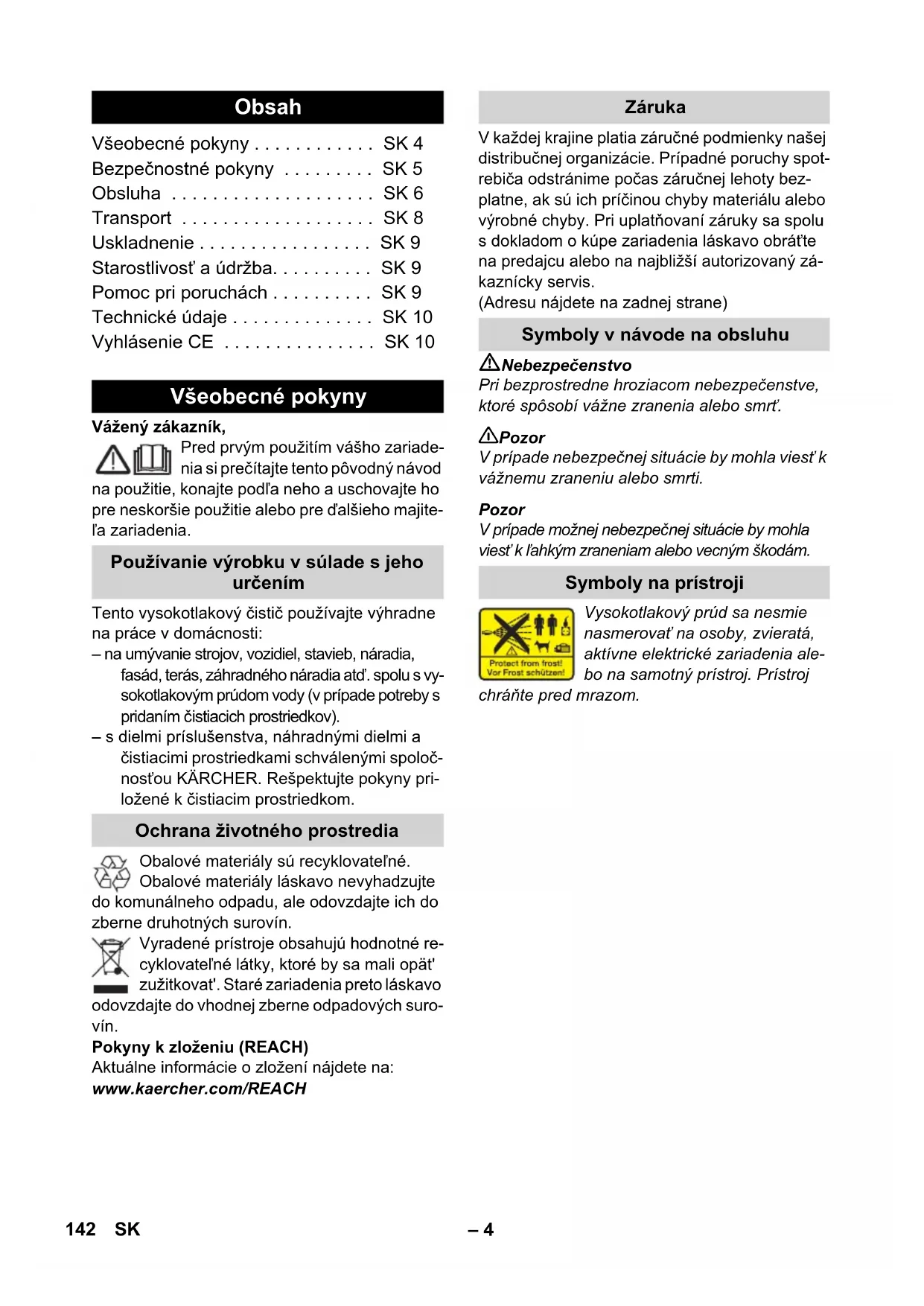 89 dB(A) Declaraţie de conformitate CE Produs: Aparat de curăţare sub presiune Tip: 1.674-xxx Directive EG respectate: 2006/42/CE (+2009/127/CE) 2004/108/CE 2000/14/CE Norme armonizate utilizate: EN 55014–1: 2006 + A1: 2009 EN 55014–2: 1997 + A2: 2008 EN 60335–1 EN 60335–2–79 EN 61000–3–2: 2006 + A2: 2009 EN 61000–3–3: 2008 EN 62233: 2008 Procedura de evaluare a conformităţii: 2000/14/CE: Anexa V Nivel de zgomot dB(A) măsurat: 86 garantat: 89 CEO Head of Approbation 141RO– 4 Vážený zákazník, Pred prvým použitím vášho zariade- nia si prečítajte tento pôvodný návod na použitie, konajte podľa neho a uschovajte ho pre neskoršie použitie alebo pre ďalšieho majite- ľa zariadenia. Tento vysokotlakový čistič používajte výhradne na práce v domácnosti: – na umývanie strojov, vozidiel, stavieb, náradia, fasád, terás, záhradného náradia atď. spolu s vy- sokotlakovým prúdom vody (v prípade potreby s pridaním čistiacich prostriedkov). – s dielmi príslušenstva, náhradnými dielmi a čistiacimi prostriedkami schválenými spoloč- nosťou KÄRCHER. Rešpektujte pokyny pri- ložené k čistiacim prostriedkom. Obalové materiály sú recyklovateľné. Obalové materiály láskavo nevyhadzujte do komunálneho odpadu, ale odovzdajte ich do zberne druhotných surovín. Vyradené prístroje obsahujú hodnotné re- cyklovateľné látky, ktoré by sa mali opät' zužitkovat'. Staré zariadenia preto láskavo odovzdajte do vhodnej zberne odpadových suro- vín. Pokyny k zloženiu (REACH) Aktuálne informácie o zložení nájdete na: www.kaercher.com/REACH V každej krajine platia záručné podmienky našej distribučnej organizácie. Prípadné poruchy spot- rebiča odstránime počas záručnej lehoty bez- platne, ak sú ich príčinou chyby materiálu alebo výrobné chyby. Pri uplatňovaní záruky sa spolu s dokladom o kúpe zariadenia láskavo obráťte na predajcu alebo na najbližší autorizovaný zá- kaznícky servis. (Adresu nájdete na zadnej strane) Nebezpečenstvo Pri bezprostredne hroziacom nebezpečenstve, ktoré spôsobí vážne zranenia alebo smrť. 몇 Pozor V prípade nebezpečnej situácie by mohla viesť k vážnemu zraneniu alebo smrti. Pozor V prípade možnej nebezpečnej situácie by mohla viesť k ľahkým zraneniam alebo vecným škodám. Vysokotlakový prúd sa nesmie nasmerovať na osoby, zvieratá, aktívne elektrické zariadenia ale- bo na samotný prístroj. Prístroj chráňte pred mrazom. Obsah Všeobecné pokyny . . . . . . . . . . . . SK 4 Bezpečnostné pokyny . . . . . . . . . SK 5 Obsluha . . . . . . . . . . . . . . . . . . . . SK 6 Transport . . . . . . . . . . . . . . . . . . . SK 8 Uskladnenie . . . . . . . . . . . . . . . . . SK 9 Starostlivosť a údržba. . . . . . . . . . SK 9 Pomoc pri poruchách . . . . . . . . . . SK 9 Technické údaje . . . . . . . . . . . . . . SK 10 Vyhlásenie CE . . . . . . . . . . . . . . . SK 10 Všeobecné pokyny Používanie výrobku v súlade s jeho určením Ochrana životného prostredia Záruka Symboly v návode na obsluhu Symboly na prístroji 142 SK– 5 Nebezpečenstvo Nikdy sa nedotýkajte sieťovej zásuvky a vid- lice vlhkými rukami. Zariadenie nepoužívajte, ak má poškodené prívodné sieťové vedenie alebo iné dôležité diely, napr. vysokotlakovú hadicu, striekaciu pištoľ alebo bezpečnostné prvky. Pred každým použitím skontrolujte, či nie je poškodený prívodný kábel alebo sieťová zástr- čka. Poškodený prívodný kábel dajte bezod- kladne vymeniť autorizovanej servisnej službe alebo kvalifikovanému elektrotechnikovi. Pred každým použitím skontrolujte, či vyso- kotlaková hadica nie je poškodená. Poško- denú vysokotlakovú hadicu neodkladne vymeňte. Používanie v priestoroch so zvýšením ne- bezpečenstvom výbuchu je zakázané. Pri používaní zariadenia v oblastiach so zvý- šeným nebezpečím (napr. čerpacie stanice pohonných hmôt) sa musia dodržiavať prí- slušné bezpečnostné predpisy. Vysokotlakový prúd môže byť pri neodbor- nom použití nebezpečný. Prúd sa nesmie nasmerovať na osoby, zvieratá, elektrické zariadenia pod napätím alebo na samotné zariadenie. Pri čistení odevu alebo obuvi nesmie byť vy- sokotlakový prúd nasmerovaný na iných ani na seba. Neostrekujte žiadne predmety obsahujúce látky škodlivé pre zdravie (napr. azbest). Pneumatiky automobilu a ventily pneumatík môže vysokotlakový prúd poškodiť a môžu prasknúť. Prvým príznakom poškodenia je zme- na sfarbenia pneumatiky. Poškodené pneumati- ky automobilu a ventily sú životne nebezpečné. Pri čistení prúdom vody dodržiavajte odstup naj- menej 30 cm! Nebezpečenstvo výbuchu! Nestriekajte žiadne horľavé kvapaliny. Nikdy nevysávajte kvapaliny s obsahom rozpúš- ťadla alebo neriedené kyseliny a rozpúšťadlá! Do tejto skupiny patrí napr. benzín, riedidlo na farby alebo vykurovací olej. Rozprašovaná hmla je vy- soko horľavá, výbušná a jedovatá. Je zakázané použitie acetónu, neriedených kyselín a rozpúš- ťadiel, pretože napadajú materiály použité v za- riadení. 몇 Pozor Sieťová zástrčka a spojka predlžovacieho kábla musia byť vodotesné a nesmú ležať vo vode. Nevhodné predlžovacie vedenia môžu byť nebezpečné. Vo vonkajšom prostredí použí- vajte výhradne schválené a patrične označe- né predlžovacie káble s dostatočným prierezom vodiča: