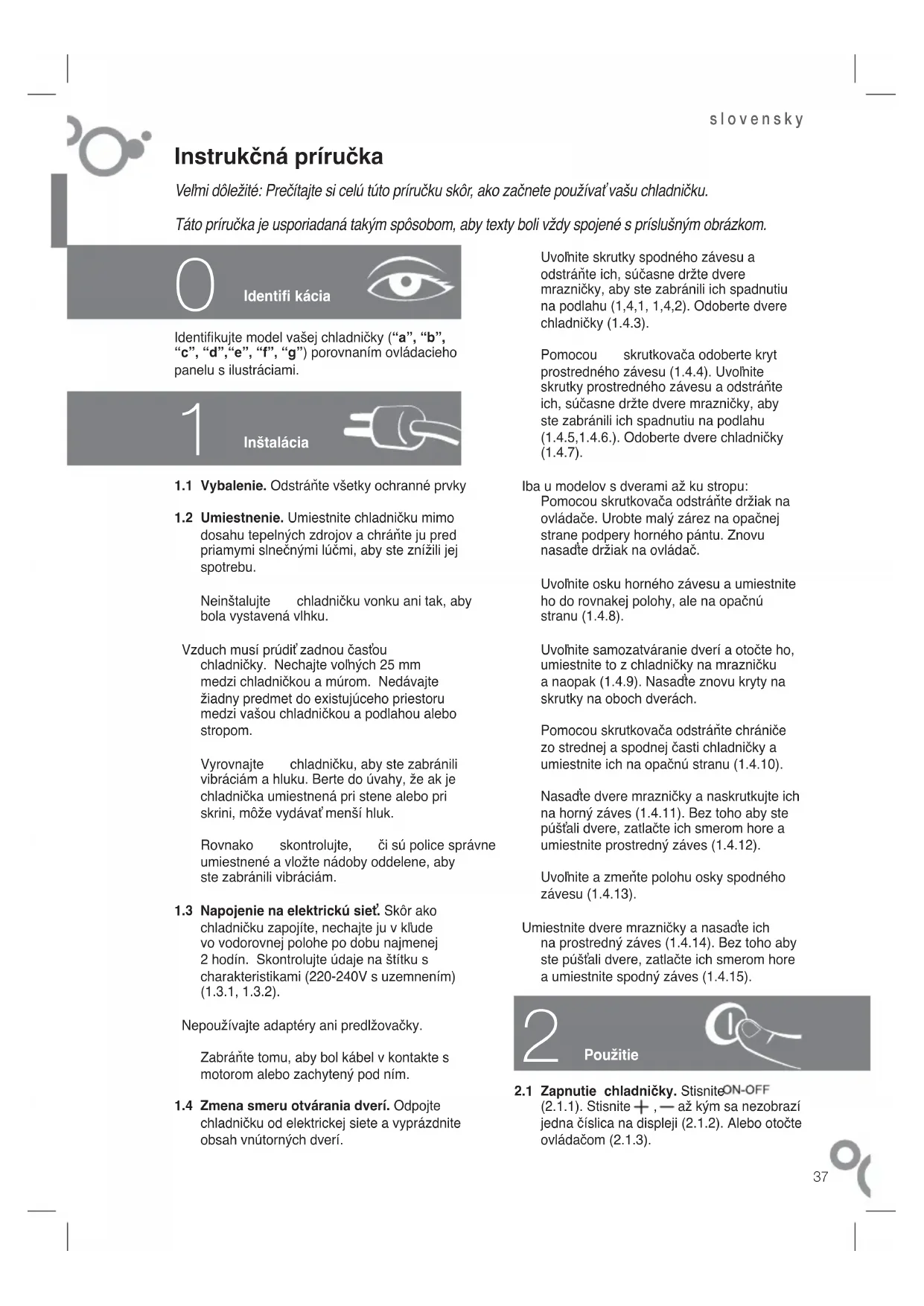 Identifi kujte model vašej chladničky (“a”, “b”, “c”, “d”,“e”, “f”, “g”) porovnaním ovládacieho panelu s ilustráciami.1.1 Vybalenie. Odstráňte všetky ochranné prvky 1.2 Umiestnenie. Umiestnite chladničku mimo dosahu tepelných zdrojov a chráňte ju pred priamymi slnečnými lúčmi, aby ste znížili jej spotrebu. Neinštalujte chladničku vonku ani tak, aby bola vystavená vlhku. Vzduch musí prúdiť zadnou časťou chladničky. Nechajte voľných 25 mm medzi chladničkou a múrom. Nedávajte žiadny predmet do existujúceho priestoru medzi vašou chladničkou a podlahou alebo stropom. Vyrovnajte chladničku, aby ste zabránili vibráciám a hluku. Berte do úvahy, že ak je chladnička umiestnená pri stene alebo pri skrini, môže vydávať menší hluk. Rovnako skontrolujte, či sú police správne umiestnené a vložte nádoby oddelene, aby ste zabránili vibráciám.1.3 Napojenie na elektrickú sieť. Skôr ako chladničku zapojíte, nechajte ju v kľude vo vodorovnej polohe po dobu najmenej 2 hodín. Skontrolujte údaje na štítku s charakteristikami (220-240V s uzemnením) (1.3.1, 1.3.2). Nepoužívajte adaptéry ani predlžovačky. Zabráňte tomu, aby bol kábel v kontakte s motorom alebo zachytený pod ním.1.4 Zmena smeru otvárania dverí. Odpojte chladničku od elektrickej siete a vyprázdnite obsah vnútorných dverí. 0