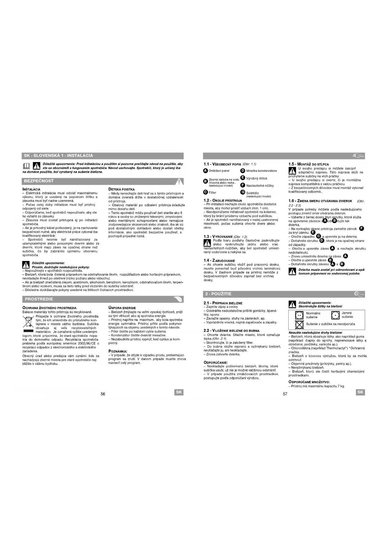 Z ASTAVENIE PRÍSTROJANa konci sušenia sa rozsvieti kontrolné svetlo„STOP“, ktoré upozorňuje na ukončenie programu (Obr. 3.2.5). Po ukončení každého cyklu bliká kontrolné svetlo„Filter” a „Plná nádoba“ aby vásupozornili, že je potrebné vyčistiť filter a vyprázdniťzbernú nádobu na vodu.— Otočte Voliča času do polohy „Stop“ .— Vyprázdnite sušičku bielizne. — Vyčistite filter a vyprázdnite zbernú nádobu na vodu (postup nájdete v kapitole „BEŽNÁ ÚDRŽBA“). P OZNÁMKA:— Funkcie „Proti krčeniu“ zostávajú zapnuté z jed-ného programu na druhý. Jednoduchým stlačenímtlačidiel môžete tieto funkcie vypnúť.