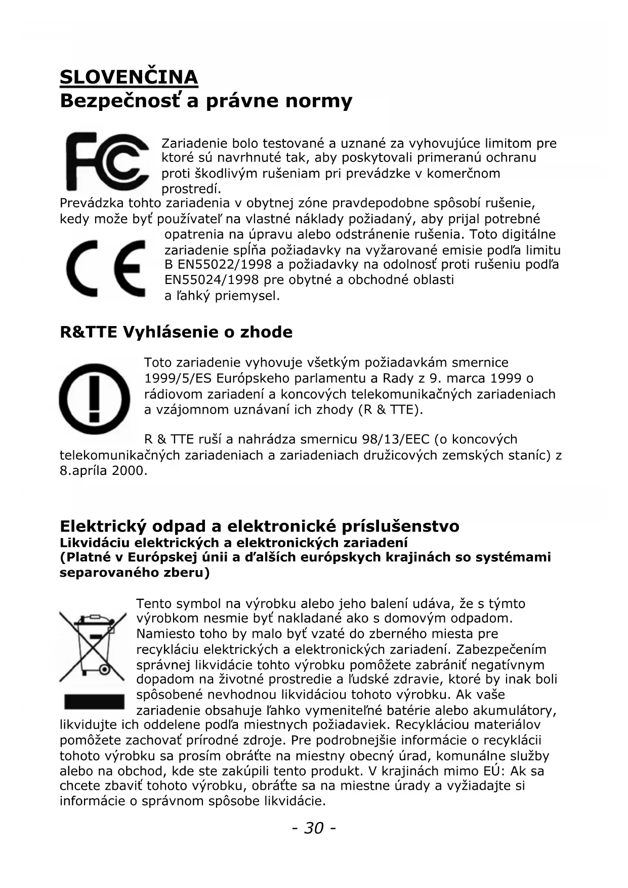 Elektrický odpad a elektronické príslušenstvo Likvidáciu elektrických a elektronických zariadení (Platné v Európskej únii a ďalších európskych krajinách so systémami separovaného zberu) Tento symbol na výrobku alebo jeho balení udáva, že s týmto výrobkom nesmie byť nakladané ako s domovým odpadom. Namiesto toho by malo byť vzaté do zberného miesta pre recykláciu elektrických a elektronických zariadení. Zabezpečením správnej likvidácie tohto výrobku pomôžete zabrániť negatívnym dopadom na životné prostredie a ľudské zdravie, ktoré by inak boli spôsobené nevhodnou likvidáciou tohoto výrobku. Ak vaše zariadenie obsahuje ľahko vymeniteľné batérie alebo akumulátory, likvidujte ich oddelene podľa miestnych požiadaviek. Recykláciou materiálov pomôžete zachovať prírodné zdroje. Pre podrobnejšie informácie o recyklácii tohoto výrobku sa prosím obráťte na miestny obecný úrad, komunálne služby alebo na obchod, kde ste zakúpili tento produkt. V krajinách mimo EÚ: Ak sa chcete zbaviť tohoto výrobku, obráťte sa na miestne úrady a vyžiadajte si informácie o správnom spôsobe likvidácie.- 31 -