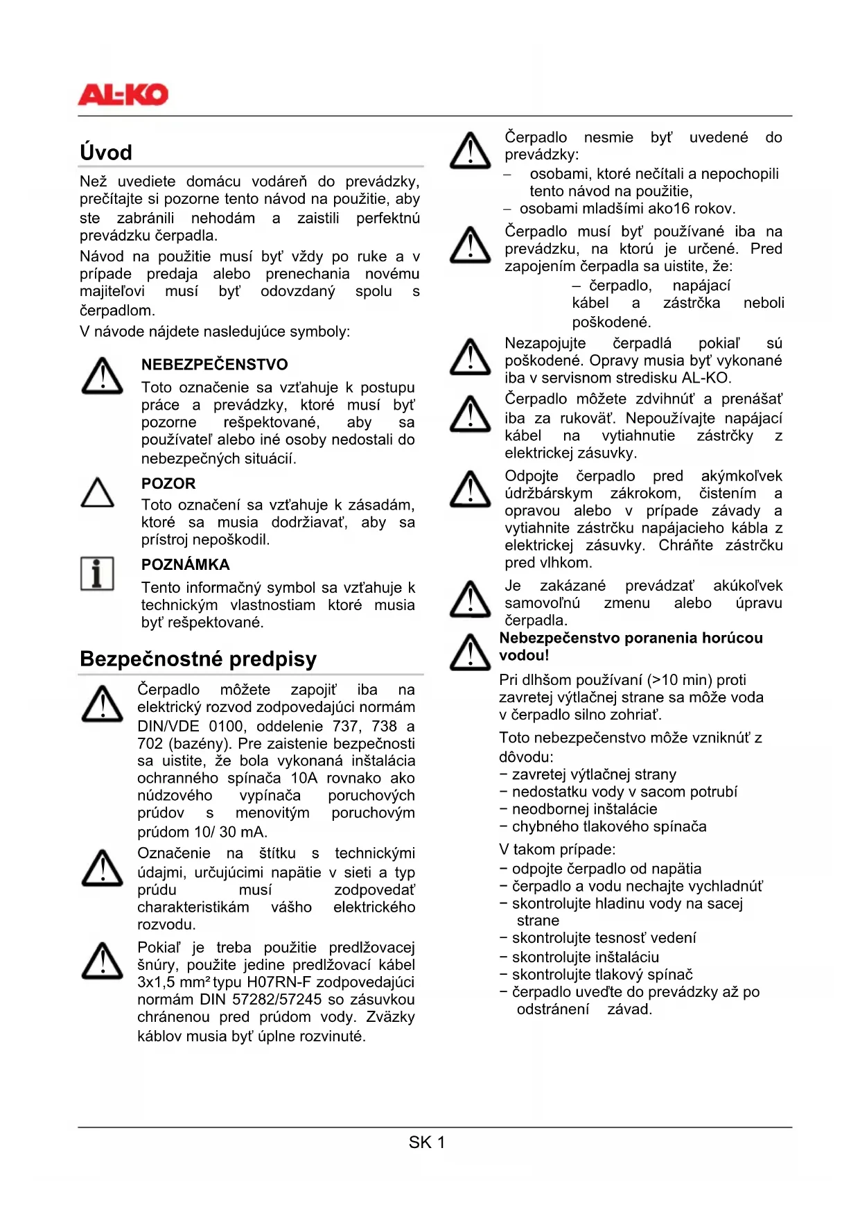 Nebezpečenstvo poranenia horúcou vodou! Pri dlhšom používaní (>10 min) proti zavretej výtlačnej strane sa môže voda v čerpadlo silno zohriať. Toto nebezpečenstvo môže vzniknúť z dôvodu: − zavretej výtlačnej strany − nedostatku vody v sacom potrubí − neodbornej inštalácie − chybného tlakového spínača V takom prípade: − odpojte čerpadlo od napätia − čerpadlo a vodu nechajte vychladnúť − skontrolujte hladinu vody na sacej strane − skontrolujte tesnosť vedení − skontrolujte inštaláciu − skontrolujte tlakový spínač − čerpadlo uveďte do prevádzky až po odstránení závad.SK 2 2BPoužívanie 10BPredpokladané používanie Čerpadlo je určené na domáce používanie v byte a na záhrade. Musí byť používané iba na účely zodpovedajúce jeho technickým vlastnostiam. Čerpadlo je vhodné k nasledujúcim účelom: − zavlažovanie záhrad a polí; − zásobovanie vody v domácnosti; − zvýšení tlaku pri zásobovaní vody v domácnosti. Dejte pozor na miestne normy stanovené pre zásobovanie. Porad'te sa s inštalatérom. Čerpadlo je vhodné iba na pumpovanie týchto kvapalín: − čistá voda; − daž'ová voda. 11BZakázané používanie Čerpadlo nesmie byť používané na nepretržitú prevádzku. Čerpadlo nie je vhodné na pumpovanie: − slanej vody; − tekutých potravín; − kal obsahujúci textilný alebo papierový zvyškový materiál; − korozívnych a chemických látok; − kyslých, zápalných, výbušných alebo prchavých kvapalín; − kvapalín teplejších ako 35˚ C; − vody s pieskom alebo brusných kvapalín. 3BPopis čerpadla 12BDomáca vodáreň/príslušenstvo (obrázky A a B) 1 Nasávací otvor/napojenie na nasávacie potrubie 2 Plniaca zátka 3 Prívodový otvor/napojenie na výtlačné potrubie 4 Motor 5 Ventil 6 Nádrž 7 Tlakomer 8 Napájací kábel 9 Vypúšťacia zátka 10 Tlakový spínač 11 Ohybná trubica 12 Telo čerpadla 13 Filter (príslušenstvo) 14 Nasávací súbor AL-KO (príslušenstvo) 13BZákladné vybavenie Domáca vodáreň je vybavená tlakovým spínačom, tlakomerom a prívodným kábelom so zástrčkou zahŕňa snímač tlaku, nápojový kábel so zásuvkou Schuko. 14BFunkcie Domáca vodáreň funguje automaticky. Čerpadlo sa zapne a vypne na základe tlaku (vid' technické údaje). Čerpadlo nasáva vodu prostredníctvom nasávacieho potrubia (1) a odvádza ju do nádrže (6). Ked' dosiahne maximálneho tlaku, určujúceho zastavenie čerpadla (nádrž je plná), čerpadlo sa samo vypne. Pokiaľ sa zníži tlak a dosiahne približne 2,0 baru (vodné zásobovanie je prerušené), čerpadlo sa automaticky zapne a naplní nádrž alebo dodáva vodu do domácnosti, kde je v tom okamžiku odoberaná. V tomto prípade sa nádrž naplní až po uzavretí kohútikov v domácej sieti. 15BTepelná ochrana Čerpadlo je vybavené tepelným spínačom, ktorý ho vypne v prípade prehriatia. Po ochladzovaní, ktoré trvá približne 15-20 minút, sa čerpadlo automaticky zapne. 4BInštalácia a uvedenie do prevádzky Pred zapojením čerpadla je treba skontrolovať tlak na vstupe membrány v čerpadle na ventile (5). Tlak musí byť približne 1,5 baru a môže byť zmenený podža potreby (vid' Kontrola tlaku na vstupe membrány).