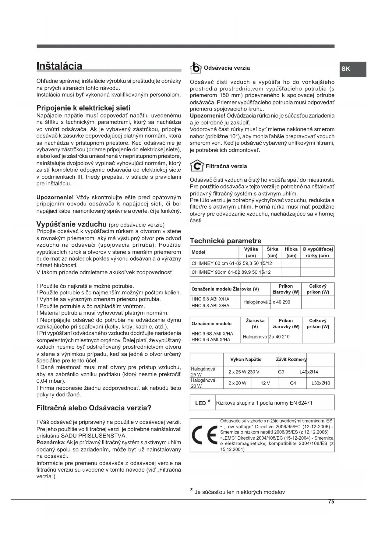 Inštalácia Ohľadne správnej inštalácie výrobku si preštudujte obrázky na prvých stranách tohto návodu. Inštalácia musí byť vykonaná kvalifi kovaným personálom. Pripojenie k elektrickej sieti Napájacie napätie musí odpovedať napätiu uvedenému na štítku s technickými parametrami, ktorý sa nachádza vo vnútri odsávača. Ak je vybavený zástrčkou, pripojte odsávač k zásuvke odpovedajúcej platným normám, ktorá sa nachádza v prístupnom priestore. Keď odsávač nie je vybavený zástrčkou (priame pripojenie do elektrickej siete), alebo keď je zástrčka umiestnená v neprístupnom priestore, nainštalujte dvojpólový vypínač vyhovujúci normám, ktorý zaistí kompletné odpojenie odsávača od elektrickej siete v podmienkach III. triedy prepätia, v súlade s pravidlami pre inštaláciu. Upozornenie! Vždy skontrolujte ešte pred opätovným pripojením obvodu odsávača k napájacej sieti, či bol napájací kábel namontovaný správne a overte, či je funkčný. Vypúšťanie vzduchu (pre odsávacie verzie) Pripojte odsávač k vypúšťacím rúrkam a otvorom v stene s rovnakým priemerom, aký má výstupný otvor pre odvod vzduchu na odsávači (spojovacia príruba). Použitie vypúšťacích rúrok a otvorov v stene s menším priemerom bude mať za následok pokles výkonu odsávania a výrazný nárast hlučnosti. V takom prípade odmietame akúkoľvek zodpovednosť. ! Použite čo najkratšie možné potrubie. ! Použite potrubie s čo najmenším možným počtom kolien. ! Vyhnite sa výrazným zmenám prierezu potrubia. ! Použite potrubie s čo najhladším vnútrom. ! Materiál potrubia musí vyhovovať platným normám. ! Nepripájajte odsávač do potrubia na odvádzanie dymu vznikajúceho pri spaľovaní (kotly, krby, kachle, atď.). ! Pri vypúšťaní odvádzaného vzduchu dodržujte nariadenia kompetentných miestnych orgánov. Ďalej platí, že vypúšťaný vzduch nesmie byť odstraňovaný prostredníctvom otvoru v stene s výnimkou prípadu, keď sa jedná o otvor určený špeciálne pre tento účel. ! Daná miestnosť musí mať otvory pre prístup vzduchu, aby sa zabránilo vzniku podtlaku (ktorý nesmie prekročiť 0,04 mbar). ! Firma neponesie žiadnu zodpovednosť, ak nebudú tieto pokyny dodržané. Filtračná alebo Odsávacia verzia? ! Váš odsávač je pripravený na použitie v odsávacej verzii. Pre jeho použitie vo fi ltračnej verzii je potrebné nainštalovať príslušnú SADU PRÍSLUŠENSTVA. Poznámka: Ak je prídavný fi ltračný systém s aktívnym uhlím dodaný spolu so zariadením, môže byť už nainštalovaný na odsávači. Informácie pre premenu odsávača z odsávacej verzie na fi ltračnú verziu sú uvedené v tomto návode (viď „Filtračná verzia“). Odsávacia verzia Odsávač čistí vzduch a vypúšťa ho do vonkajšieho prostredia prostredníctvom vypúšťacieho potrubia (s priemerom 150 mm) pripevneného k spojovacej prírube odsávača. Priemer vypúšťacieho potrubia musí odpovedať priemeru spojovacieho kruhu. Upozornenie! Odvádzacia rúrka nie je súčasťou zariadenia a je potrebné ju zakúpiť. Vodorovná časť rúrky musí byť mierne naklonená smerom nahor (približne 10°), aby mohla ľahšie prepravovať vzduch smerom von. Keď je odsávač vybavený uhlíkovými fi ltrami, je potrebné ich odmontovať. Filtračná verzia Odsávač čistí vzduch a čistý ho vpúšťa späť do miestnosti. Pre použitie odsávača v tejto verzii je potrebné nainštalovať prídavný fi ltračný systém s aktívnym uhlím. Pre túto verziu je potrebný vychyľovač vzduchu, redukcia a fi lter/re s aktívnym uhlím. Horná rúrka musí mať pozdĺžne otvory pre odvádzanie vzduchu, nachádzajúce sa v hornej časti. Technické parametre ModelVýška (cm) Šírka (cm) Hĺbka (cm) Ø vypúšťacej rúrky (cm)CHIMNEY 60 cm 61-82 59,8 50 15/12CHIMNEY 90cm 61-82 89,9 50 15/12Označenie modelu Žiarovka (V)Príkon žiarovky (W)Celkový príkon (W)HNC 6.8 ABI X/HAHNC 9.8 ABI X/HAHalogénová 2 x 40 290Označenie modeluŽiarovka (V) Príkon žiarovky (W)Celkový príkon (W)HNC 9.6S AMI X/HAHNC 6.6 AMI X/HAHalogénová 2 x 40 210Výkon Napätie Závit RozmeryHalogénová 25 W 2 x 25 W 230 V G9 L40xØ14Halogénová 20 W 2 x 20 W 12 V G4 L30xØ10LED *Riziková skupina 1 podľa normy EN 62471Odsávače sú v zhode s nižšie uvedenými smernicami ES:• „Low voltage“ Directive 2006/95/EC (12-12-2006) - Smernica o nízkom napätí 2006/95/ES (z 12.12.2006)• „EMC“ Directive 2004/108/EC (15-12-2004) - Smernica o elektromagnetickej kompatibilite 2004/108/ES (z 15.12.2004)