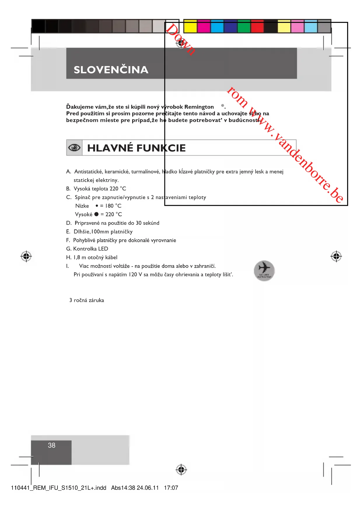 Dávajte pozor, aby ste nepoškriabali povrch plôch. Jeho poškodenie nepriaznivo ovplyvňuje účinnosť keramického povrchu. ČISTENIE A ÚDRŽBA Zabezpečte, aby bol prístroj vypnutý zo zásuvky a vychladnutý. Pomocou navlhčenejhandričky umyte do čista akékoľvek nahromadené zvyšky výrobkov na úpravuvlasov.Na čistenie nepoužívajte abrazívne čistiace prostriedky,pretože by to mohlo viesť kpoškodeniam.110441_REM_IFU_S1510_21L+.indd Abs15:39 24.06.11 17:07Downloaded from www.vandenborre.be