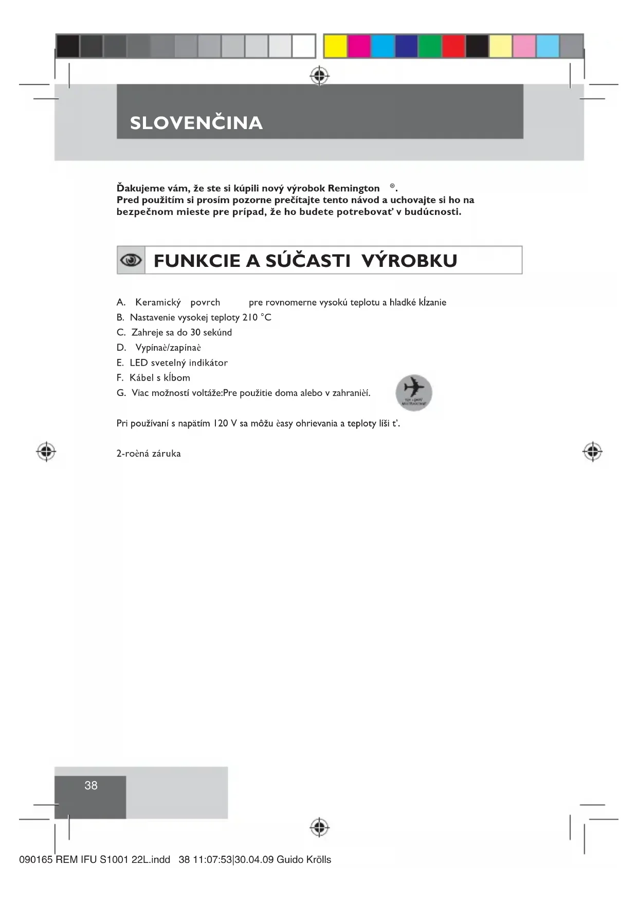 SRB SK SLOVENČINA SERVIS A ZÁRUKA Tento výrobok bol skontrolovaný a neobsahuje žiadne chyby. Záruka sa vzťahuje na chyby materiálu alebo spracovania, a záručná doba plynie dátumom zakúpenia zákazníkom. Ak sa výrobok počas záručnej doby pokazí, bezplatne ho opravíme, vymeníme akúkoľvek jeho súčasť alebo aj celý výrobok, za predpokladu, že existuje dôkaz o jeho zakúpení. To však neznamená, že sa predĺži záručná doba opraveného alebo vymeneného výrobku.V prípade reklamácie prosím kontaktujte servisné stredisko Remington ® vo svojomregióne.Ide o záruku mimo bežných zákonných práv spotrebiteľa.Táto záruka platí vo všetkých krajinách, v ktorých náš výrobok predávajú autorizovanídíleri.Táto záruka sa nevzťahuje na poškodenie výrobku, ktoré vzniklo nesprávnym používaním,poškodzovaním, zásahom do výrobku alebo používaním v rozpore s nevyhnutnými technickými a/alebo bezpečnostnými inštrukciami. Záruku nemožno uplatniť, ak bol výrobok rozobratý alebo opravovaný nami neautorizovanou osobou.090165 REM IFU S1001 22L.indd 41 11:07:54|30.04.09 Guido Krölls OCHRANA ŽIVOTNÉHO PROSTREDIA Na konci životnosti holiaci strojček nevyhadzujte do komunálneho odpadu. Likvidáciu vykonávajú naše servisné strediská Remington ® alebo príslušné zberné miesta. Ďalšie informácie o recyklácii nájdete na www.remingtom-europe.com42