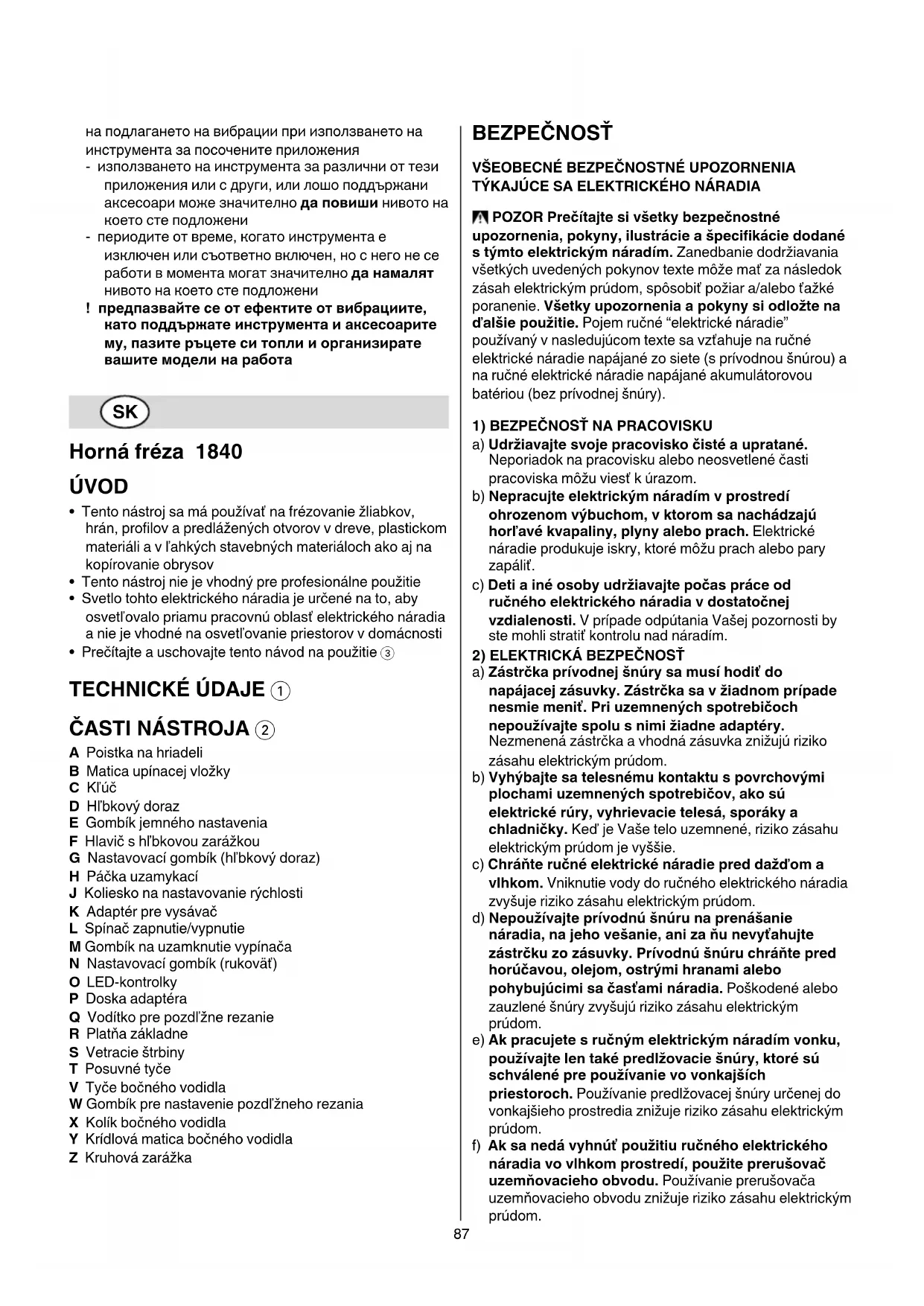 A Poistka na hriadeli B Matica upínacej vložky C Kľúč D Hľbkový doraz E Gombík jemného nastavenia F Hlavič s hľbkovou zarážkou G Nastavovací gombík (hľbkový doraz) H Páčka uzamykací J Koliesko na nastavovanie rýchlosti K Adaptér pre vysávač L Spínač zapnutie/vypnutie M Gombík na uzamknutie vypínača N Nastavovací gombík (rukoväť) O LED-kontrolky P Doska adaptéra Q Vodítko pre pozdľžne rezanie R Platňa základne S Vetracie štrbiny T Posuvné tyče V Tyče bočného vodidla W Gombík pre nastavenie pozdľžneho rezania X Kolík bočného vodidla Y Krídlová matica bočného vodidla Z Kruhová zarážka BEZPEČNOSŤ