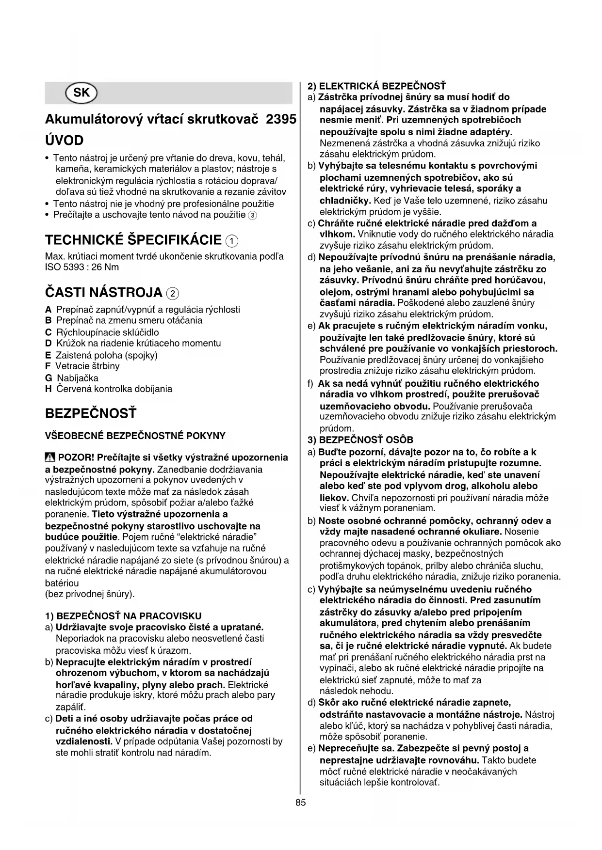 A Prepínač zapnúť/vypnúť a regulácia rýchlosti B Prepínač na zmenu smeru otáčania C Rýchloupínacie sklúčidlo D Krúžok na riadenie krútiaceho momentu E Zaistená poloha (spojky) F Vetracie štrbiny G Nabíjačka H Červená kontrolka dobíjania BEZPEČNOSŤ