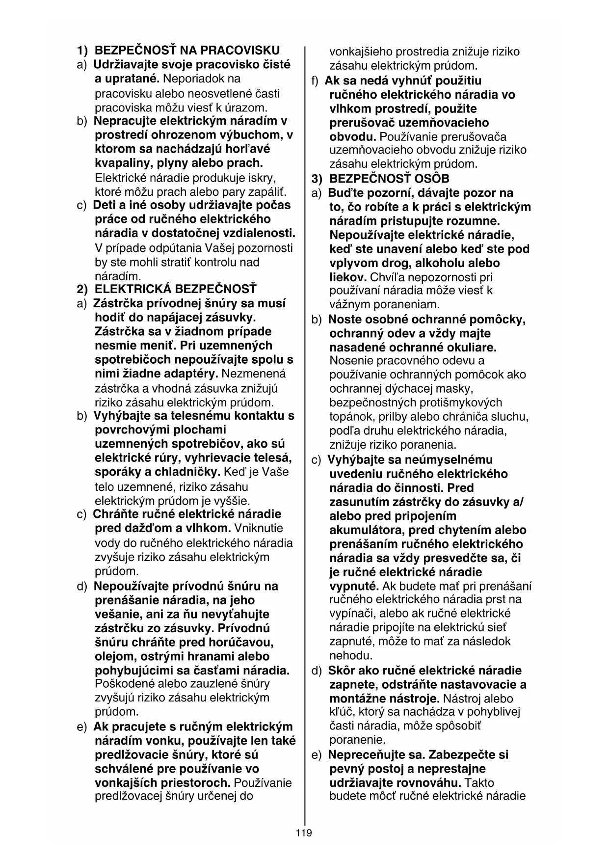 POKYNY POZOR! Prečítajte si všetky výstražné upozornenia a bezpečnostné pokyny. Zanedbanie dodržiavania výstražných upozornení a pokynov uvedených v nasledujúcom texte môže mať za následok zásah elektrickým prúdom, spôsobiť požiar a/ alebo ťažké poranenie. Tieto výstražné upozornenia a bezpečnostné pokyny starostlivo uschovajte na budúce použitie. Pojem ručné “elektrické náradie” používaný v nasledujúcom texte sa vzťahuje na ručné elektrické náradie napájané zo siete (s prívodnou šnúrou) a na ručné elektrické náradie napájané akumulátorovou batériou (bez prívodnej šnúry).119
