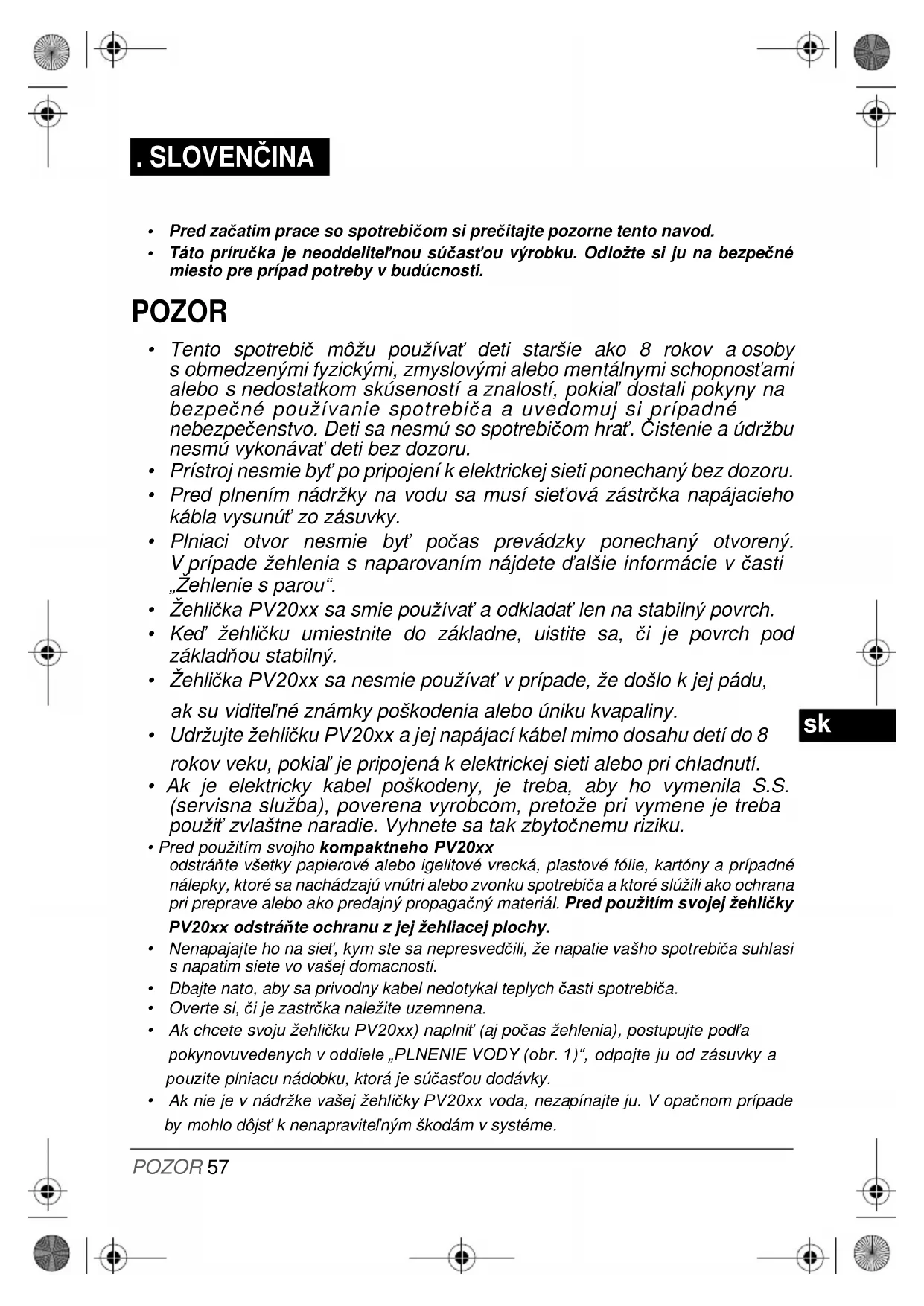 - Žehlička PV20xx sa nesmie používať v prípade, že došlo k jej pádu, ak sú viditeľné známky poškodenia alebo úniku kvapaliny.
