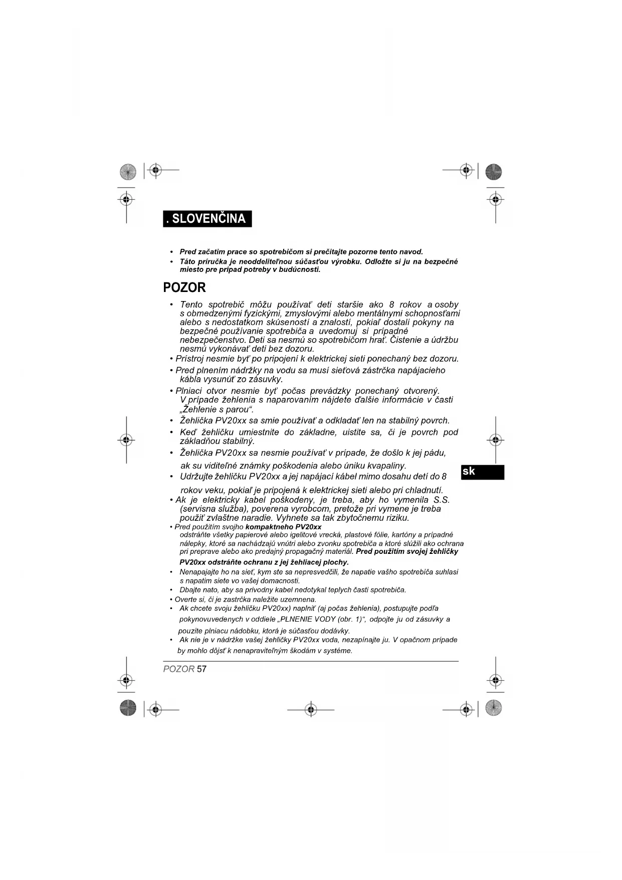 1 Na cistenie vonkajšej casti vašej žehlicky používajte handricku navlhcenú v mydlovejvode. Na cistenie žehlicky nepoužívajte rozpúštadlá alebo abrazívne produkty, pretože môžu poškodit niektoré plastové diely a/alebo odstránit niektoré znacky a/alebo nápisy.2 Žehlicku skladujte vo zvislej polohe, pricom kábel omotajte okolo základne a zatlacteho do svorky na prichytenie. ! Hoci napájací kábel sa otáca o 360°, pri jeho navíjaní okolo zariadenia pri prvej otácke ho NIKDY NETAHAJTE SILNO. SAMOCISTENIE ! Samocistenie vám odporúcame vykonávat približne raz mesacne, v závislosti od frekvencie používania a od tvrdosti používanej vody.1 Uistite sa, že zásobník je do polovice naplnený vodou.2 Žehlicku dajte do vertikálnej polohy.3 Pripojte žehlicku k sieti a nastavte regulátor teploty (9) do polohy Max. 4 Pockajte, kým sa indikátor (11) nevypne, co signalizuje, že zariadenie dosiahlo požadovanú teplotu.5 Regulátor teploty (9) otocte do polohy 0 a odpojte žehlicku od siete.62 USKLADNENIE A CISTENIE !"#$%&'()*+$+,-").+)#+/%0+1-2$1"3)*+$+#4)15.)(6785.$+6)5$"9+)%1+(8#+.1+() )))))))12.+9+()5):-$5&-")-$5&%.$+)15):56+&%:-"1%");<=>?)!"#$%&'()./,-"8)-"3-+)*+$+#")5) )))))))3"61")@+()#79-")0+):-/514)15):-/51(?)A)+-8+/+8)15,"#$%&'")9(.")84B#2.05-C)*5/5 ))))))5)8+.5D)'-+/E)84&%:-%5)F*%1()5)1"&%:-+-4? Pri vykonávaní tejto cinnosti dávajte pozor, pretože voda a para sú horúce a môžu spôsobit popáleniny. !!! !"#$%&'()*+,!()-(.!/,$&0#1!+(2-#-"3(*(2-%&*+,!4(&56(72#1!(1!.3%"#*)1!8 ((9(((Žehliacu plochu vycistite vlhkou látkou. Pamätajte, že poškodenia spôsobené vplyvom vodného kamena nie sú zahrnuté v záruke.63