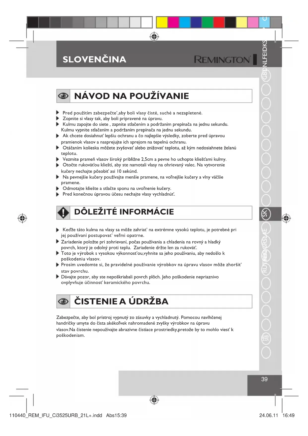 Dávajte pozor, aby ste nepoškriabali povrch plôch. Jeho poškodenie nepriaznivo ovplyvňuje účinnosť keramického povrchu. ČISTENIE A ÚDRŽBA Zabezpečte, aby bol prístroj vypnutý zo zásuvky a vychladnutý. Pomocou navlhčenejhandričky umyte do čista akékoľvek nahromadené zvyšky výrobkov na úpravuvlasov.Na čistenie nepoužívajte abrazívne čistiace prostriedky,pretože by to mohlo viesť kpoškodeniam.110440_REM_IFU_Ci3525URB_21L+.indd Abs15:39 24.06.11 16:49SLOVEN INA