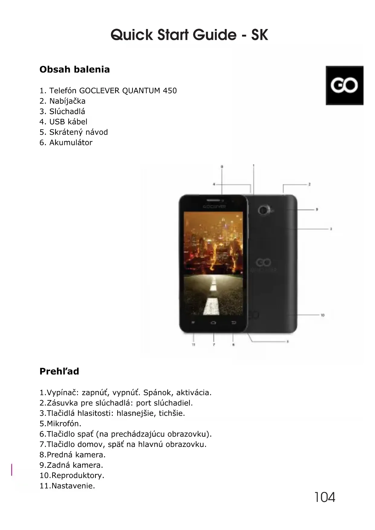 103Prehľad 1.Vypínač: zapnúť, vypnúť. Spánok, aktivácia. 2.Zásuvka pre slúchadlá: port slúchadiel. 3.Tlačidlá hlasitosti: hlasnejšie, tichšie. 5.Mikrofón. 6.Tlačidlo spať (na prechádzajúcu obrazovku). 7.Tlačidlo domov, späť na hlavnú obrazovku. 8.Predná kamera. 9.Zadná kamera. 10.Reproduktory. 11.Nastavenie. Obsah balenia