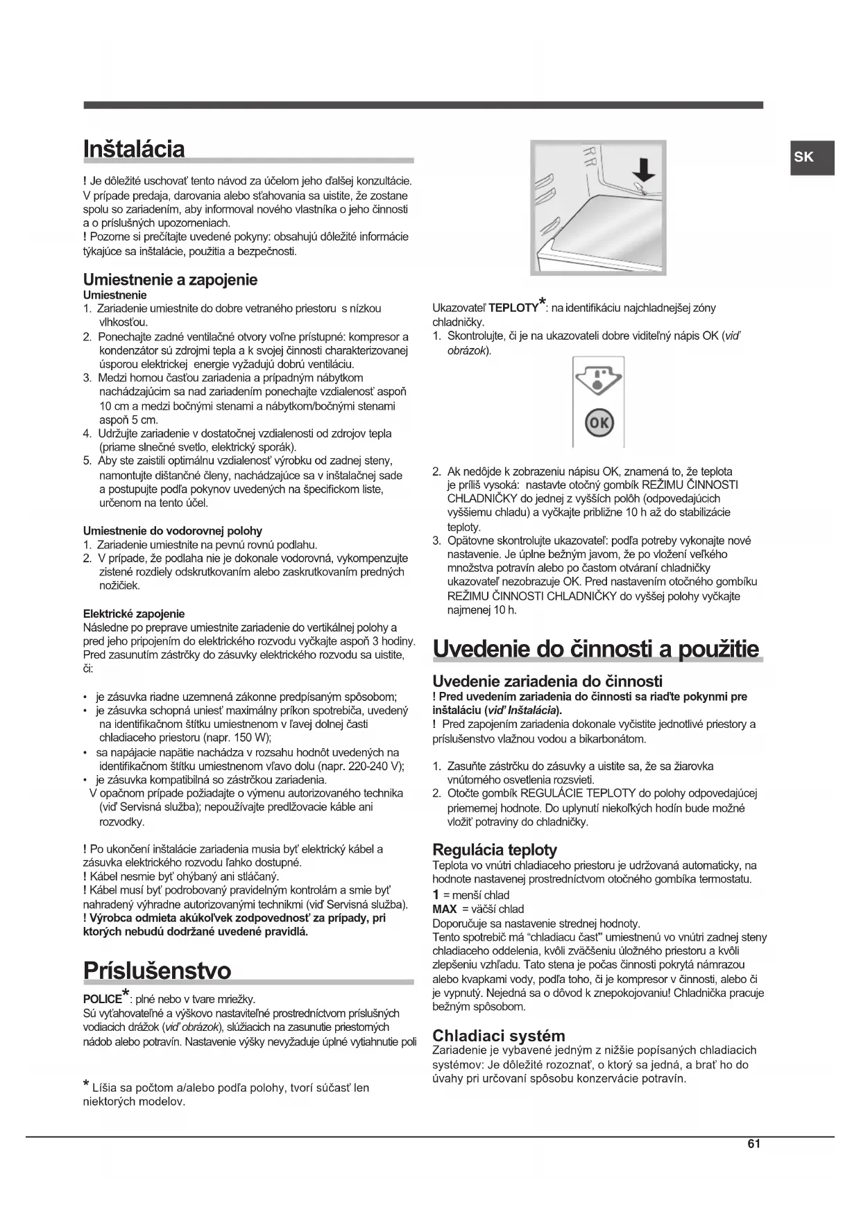 - je zásuvka riadne uzemnená zákonne predpísaným spôsobom;• je zásuvka schopná uniesť maximálny príkon spotrebiča, uvedený na identikačnom štítku umiestnenom v ľavej dolnej časti chladiaceho priestoru (napr. 150 W); • sa napájacie napätie nachádza v rozsahu hodnôt uvedených na identikačnom štítku umiestnenom vľavo dolu (napr. 220-240 V); • je zásuvka kompatibilná so zástrčkou zariadenia. V opačnom prípade požiadajte o výmenu autorizovaného technika (viď Servisná služba); nepoužívajte predlžovacie káble ani rozvodky.! Po ukončení inštalácie zariadenia musia byť elektrický kábel a zásuvka elektrického rozvodu ľahko dostupné.! Kábel nesmie byť ohýbaný ani stláčaný.! Kábel musí byť podrobovaný pravidelným kontrolám a smie byť nahradený výhradne autorizovanými technikmi (viď Servisná služba).! Výrobca odmieta akúkoľvek zodpovednosť za prípady, pri ktorých nebudú dodržané uvedené pravidlá. Príslušenstvo POLICE*: plné nebo v tvare mriežky. Sú vyťahovateľné a výškovo nastaviteľné prostredníctvom príslušných vodiacich drážok (viď obrázok), slúžiacich na zasunutie priestorných nádob alebo potravín. Nastavenie výšky nevyžaduje úplné vytiahnutie poli Ukazovateľ TEPLOTY*: na identikáciu najchladnejšej zóny chladničky.1. Skontrolujte, či je na ukazovateli dobre viditeľný nápis OK (viď obrázok).2. Ak nedôjde k zobrazeniu nápisu OK, znamená to, že teplota je príliš vysoká: nastavte otočný gombík REŽIMU ČINNOSTI CHLADNIČKY do jednej z vyšších polôh (odpovedajúcich vyššiemu chladu) a vyčkajte približne 10 h až do stabilizácie teploty.3. Opätovne skontrolujte ukazovateľ: podľa potreby vykonajte nové nastavenie. Je úplne bežným javom, že po vložení veľkého množstva potravín alebo po častom otváraní chladničky ukazovateľ nezobrazuje OK. Pred nastavením otočného gombíku REŽIMU ČINNOSTI CHLADNIČKY do vyššej polohy vyčkajte najmenej 10 h. Uvedenie do činnosti a použitie Uvedenie zariadenia do činnosti ! Pred uvedením zariadenia do činnosti sa riaďte pokynmi pre inštaláciu (viď Inštalácia).! Pred zapojením zariadenia dokonale vyčistite jednotlivé priestory a príslušenstvo vlažnou vodou a bikarbonátom.1. Zasuňte zástrčku do zásuvky a uistite sa, že sa žiarovka vnútorného osvetlenia rozsvieti.2. Otočte gombík REGULÁCIE TEPLOTY do polohy odpovedajúcej priemernej hodnote. Do uplynutí niekoľkých hodín bude možné vložiť potraviny do chladničky. Regulácia teploty Teplota vo vnútri chladiaceho priestoru je udržovaná automaticky, na hodnote nastavenej prostredníctvom otočného gombíka termostatu. 1 = menší chlad MAX = väčší chladDoporučuje sa nastavenie strednej hodnoty.Tento spotrebič má “chladiacu časť” umiestnenú vo vnútri zadnej steny chladiaceho oddelenia, kvôli zväčšeniu úložného priestoru a kvôli zlepšeniu vzhľadu. Tato stena je počas činnosti pokrytá námrazou alebo kvapkami vody, podľa toho, či je kompresor v činnosti, alebo či je vypnutý. Nejedná sa o dôvod k znepokojovaniu! Chladnička pracuje bežným spôsobom. Chladiaci systém Zariadenie je vybavené jedným z nižšie popísaných chladiacich systémov: Je dôležité rozoznať, o ktorý sa jedná, a brať ho do úvahy pri určovaní spôsobu konzervácie potravín.