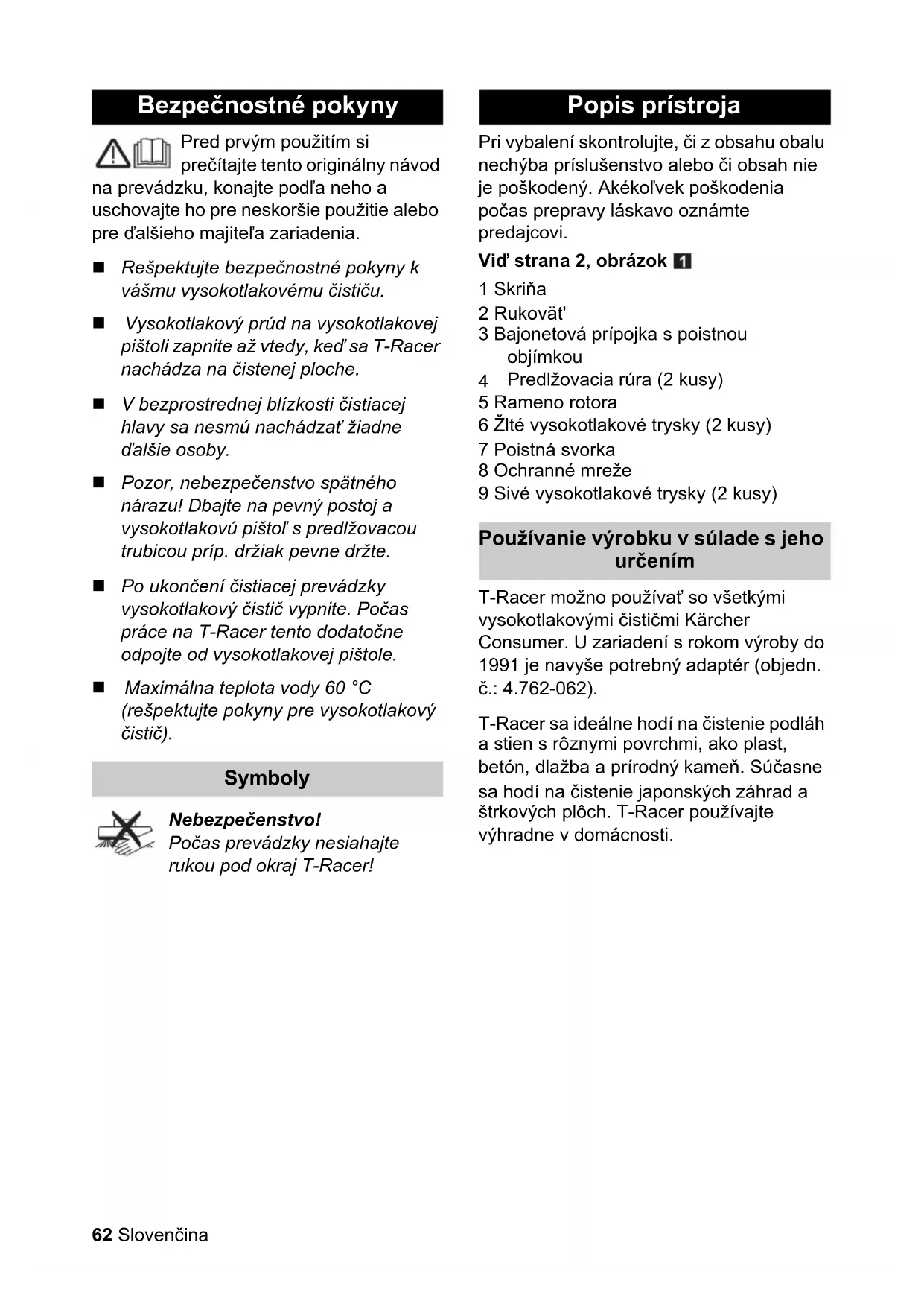 de utilizare. În fiecare ţară sunt valabile condiţiile de garanţie publicate de distribuitorul nostru din ţara respectivă. Eventuale defecţiuni ale acestui aparat, care survin în perioada de garanţie şi care sunt rezultatul unor defecte de fabricaţie sau de material, vor fi remediate gratuit. Pentru a putea beneficia de garanţie, prezentaţi-vă cu chitanţa de cumpărare la magazin sau la cea mai apropiată unitate de service autorizată. După utilizare, curăţaţi aparatul cu o cârpă umedă. Remedierea defecţiunilor Observaţii generale Protecţia mediului înconjurător Indiciu Piese de schimb Garanţie Îngrijirea62 Slovenčina Pred prvým použitím si prečítajte tento originálny návod na prevádzku, konajte podľa neho a uschovajte ho pre neskoršie použitie alebo pre ďalšieho majiteľa zariadenia. Rešpektujte bezpečnostné pokyny k vášmu vysokotlakovému čističu. Vysokotlakový prúd na vysokotlakovej pištoli zapnite až vtedy, keď sa T-Racer nachádza na čistenej ploche. V bezprostrednej blízkosti čistiacej hlavy sa nesmú nachádzať žiadne ďalšie osoby. Pozor, nebezpečenstvo spätného nárazu! Dbajte na pevný postoj a vysokotlakovú pištoľ s predlžovacou trubicou príp. držiak pevne držte. Po ukončení čistiacej prevádzky vysokotlakový čistič vypnite. Počas práce na T-Racer tento dodatočne odpojte od vysokotlakovej pištole. Maximálna teplota vody 60 °C (rešpektujte pokyny pre vysokotlakový čistič). Nebezpečenstvo! Počas prevádzky nesiahajte rukou pod okraj T-Racer! Pri vybalení skontrolujte, či z obsahu obalu nechýba príslušenstvo alebo či obsah nie je poškodený. Akékoľvek poškodenia počas prepravy láskavo oznámte predajcovi. Viď strana 2, obrázok 1 Skriňa 2 Rukovät' 3 Bajonetová prípojka s poistnou obj ímkou