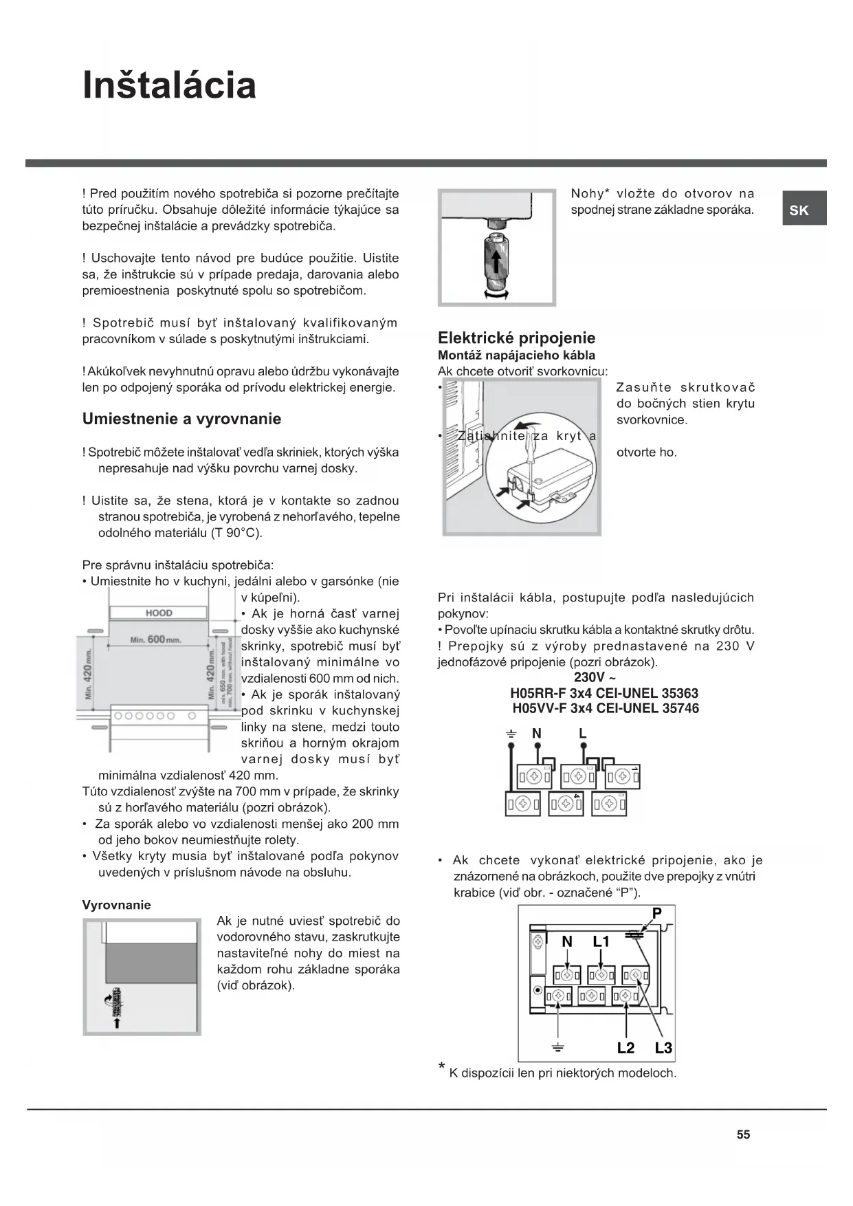 ! Spotrebič môžete inštalovať vedľa skriniek, ktorých výška nepresahuje nad výšku povrchu varnej dosky. ! Uistite sa, že stena, ktorá je v kontakte so zadnou stranou spotrebiča, je vyrobená z nehorľavého, tepelne odolného materiálu (T 90°C). Pre správnu inštaláciu spotrebiča: • Umiestnite ho v kuchyni, jedálni alebo v garsónke (nie v kúpeľni).• Ak je horná časť varnej dosky vyššie ako kuchynské skrinky, spotrebič musí byť inštalovaný minimálne vo vzdialenosti 600 mm od nich.• Ak je sporák inštalovaný pod skrinku v kuchynskej linky na stene, medzi touto skriňou a horným okrajom varnej dosky musí byť minimálna vzdialenosť 420 mm. Túto vzdialenosť zvýšte na 700 mm v prípade, že skrinky sú z horľavého materiálu (pozri obrázok). • Za sporák alebo vo vzdialenosti menšej ako 200 mm od jeho bokov neumiestňujte rolety.• Všetky kryty musia byť inštalované podľa pokynov uvedených v príslušnom návode na obsluhu. VyrovnanieAk je nutné uviesť spotrebič do vodorovného stavu, zaskrutkujte nastaviteľné nohy do miest na každom rohu základne sporáka (viď obrázok).Nohy* vložte do otvorov na spodnej strane základne sporáka. Elektrické pripojenie Montáž napájacieho káblaAk chcete otvoriť svorkovnicu: • Zasuňte skrutkovač do bočných stien krytu svorkovnice.• Zatiahnite za kryt a otvorte ho.Pri inštalácii kábla, postupujte podľa nasledujúcich pokynov:• Povoľte upínaciu skrutku kábla a kontaktné skrutky drôtu.! Prepojky sú z výroby prednastavené na 230 V jednofázové pripojenie (pozri obrázok).• Ak chcete vykonať elektrické pripojenie, ako je znázornené na obrázkoch, použite dve prepojky z vnútri krabice (viď obr. - označené “P”). Inštalácia