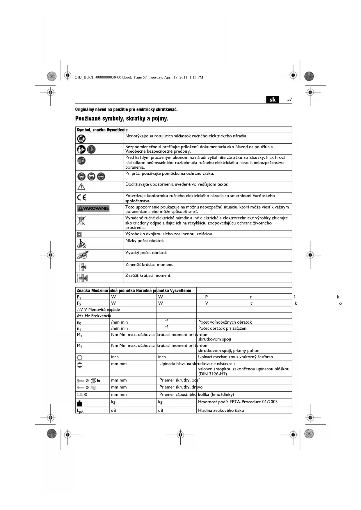 Originálny návod na použitie pre elektrický skrutkovač. Používané symboly, skratky a pojmy. Symbol, značka Vysvetlenie Nedotýkajte sa rotujúcich súčiastok ručného elektrického náradia. Bezpodmienečne si prečítajte priloženú dokumentáciu ako Návod na použitie a Všeobecné bezpečnostné predpisy. Pred každým pracovným úkonom na náradí vytiahnite zástrčku zo zásuvky. Inak hrozí následkom neúmyselného rozbehnutia ručného elektrického náradia nebezpečenstvo poranenia. Pri práci používajte pomôcku na ochranu zraku. Dodržiavajte upozornenia uvedené vo vedľajšom texte! Potvrdzuje konformitu ručného elektrického náradia so smernicami Európskeho spoločenstva. Toto upozornenie poukazuje na možnú nebezpečnú situáciu, ktorá môže viesť k vážnym poraneniam alebo môže spôsobiť smrť. Vyradené ručné elektrické náradie a iné elektrické a elektrotechnické výrobky zbierajte ako triedený odpad a dajte ich na recykláciu zodpovedajúcu ochrane životného prostredia. Výrobok s dvojitou alebo zosilnenou izoláciou Nízky počet obrátok Vysoký počet obrátok Zmenšiť krútiaci moment Zväčšiť krútiaci moment Značka Medzinárodná jednotka Národná jednotka Vysvetlenie