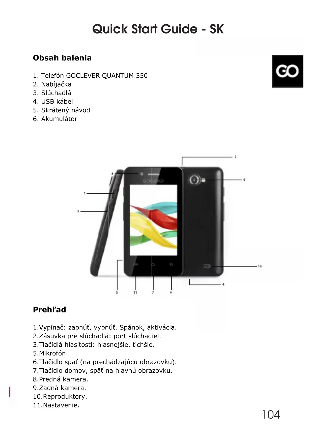 103Prehľad 1.Vypínač: zapnúť, vypnúť. Spánok, aktivácia. 2.Zásuvka pre slúchadlá: port slúchadiel. 3.Tlačidlá hlasitosti: hlasnejšie, tichšie. 5.Mikrofón. 6.Tlačidlo spať (na prechádzajúcu obrazovku). 7.Tlačidlo domov, späť na hlavnú obrazovku. 8.Predná kamera. 9.Zadná kamera. 10.Reproduktory. 11.Nastavenie. Obsah balenia