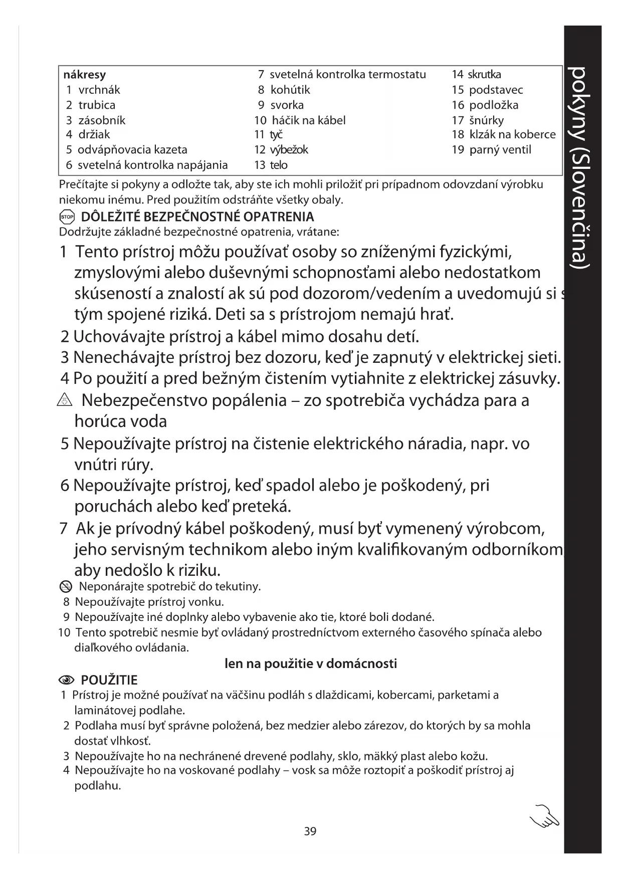 Prečítajte si pokyny a odložte tak, aby ste ich mohli priložiť pri prípadnom odovzdaní výrobku niekomu inému. Pred použitím odstráňte všetky obaly. A DÔLEŽITÉ BEZPEČNOSTNÉ OPATRENIA Dodržujte základné bezpečnostné opatrenia, vrátane: 1 Tento prístroj môžu používať osoby so zníženými fyzickými, zmyslovými alebo duševnými schopnosťami alebo nedostatkom skúseností a znalostí ak sú pod dozorom/vedením a uvedomujú si s tým spojené riziká. Deti sa s prístrojom nemajú hrať. 2 Uchovávajte prístroj a kábel mimo dosahu detí. 3 Nenechávajte prístroj bez dozoru, keď je zapnutý v elektrickej sieti. 4 Po použití a pred bežným čistením vytiahnite z elektrickej zásuvky. $ Nebezpečenstvo popálenia – zo spotrebiča vychádza para a horúca voda 5 Nepoužívajte prístroj na čistenie elektrického náradia, napr. vo vnútri rúry. 6 Nepoužívajte prístroj, keď spadol alebo je poškodený, pri poruchách alebo keď preteká. 7 Ak je prívodný kábel poškodený, musí byť vymenený výrobcom, jeho servisným technikom alebo iným kvalifikovaným odborníkom, aby nedošlo k riziku. H Neponárajte spotrebič do tekutiny. 8 Nepoužívajte prístroj vonku. 9 Nepoužívajte iné doplnky alebo vybavenie ako tie, ktoré boli dodané. 10 Tento spotrebič nesmie byť ovládaný prostredníctvom externého časového spínača alebo diaľkového ovládania. len na použitie v domácnosti