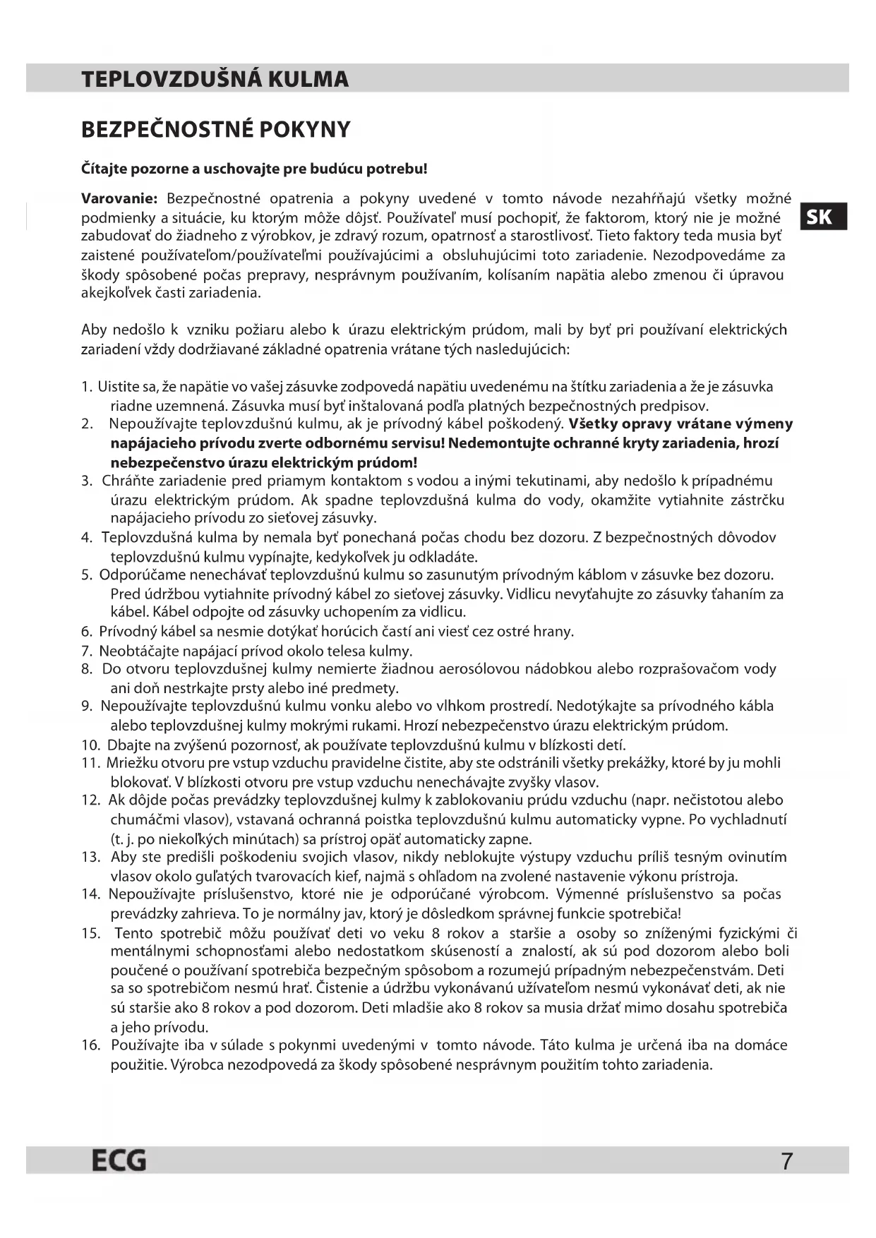 Baliaci papier avlnitá lepenka – odovzdajte do zberných surovín. Prebalová fólia, PE vrecká, plastové diely – vyhadzujte do kontajnerov na plasty. LIKVIDÁCIA VÝROBKU PO SKONČENÍ ŽIVOTNOSTI Likvidácia použitých elektrických aelektronických zariadení (platí včlenských krajinách EÚ aďalších európskych krajinách so zavedeným systémom triedenia odpadu) Vyobrazený symbol na produkte alebo na obale znamená, že sproduktom by sa nemalo nakladať ako s domovým odpadom. Produkt odovzdajte na miesto určené na recykláciu elektrických a elektronických zariadení. Správnou likvidáciou produktu zabránite negatívnym vplyvom na ľudské zdravie a životné prostredie. Recyklácia materiálov prispieva kochrane prírodných zdrojov. Viac informácií orecyklácii tohto produktu vám poskytne obecný úrad, organizácia na spracovanie domového odpadu alebo predajné miesto, kde ste produkt kúpili. Tento výrobok spĺňa požiadavky smerníc EÚ o elektromagnetickej kompatibilite a elektrickej bezpečnosti. Návod na obsluhu je k dispozícii na webových stránkach www.ecg.sk. Zmena textu a technických parametrov vyhradená. 08/05PL