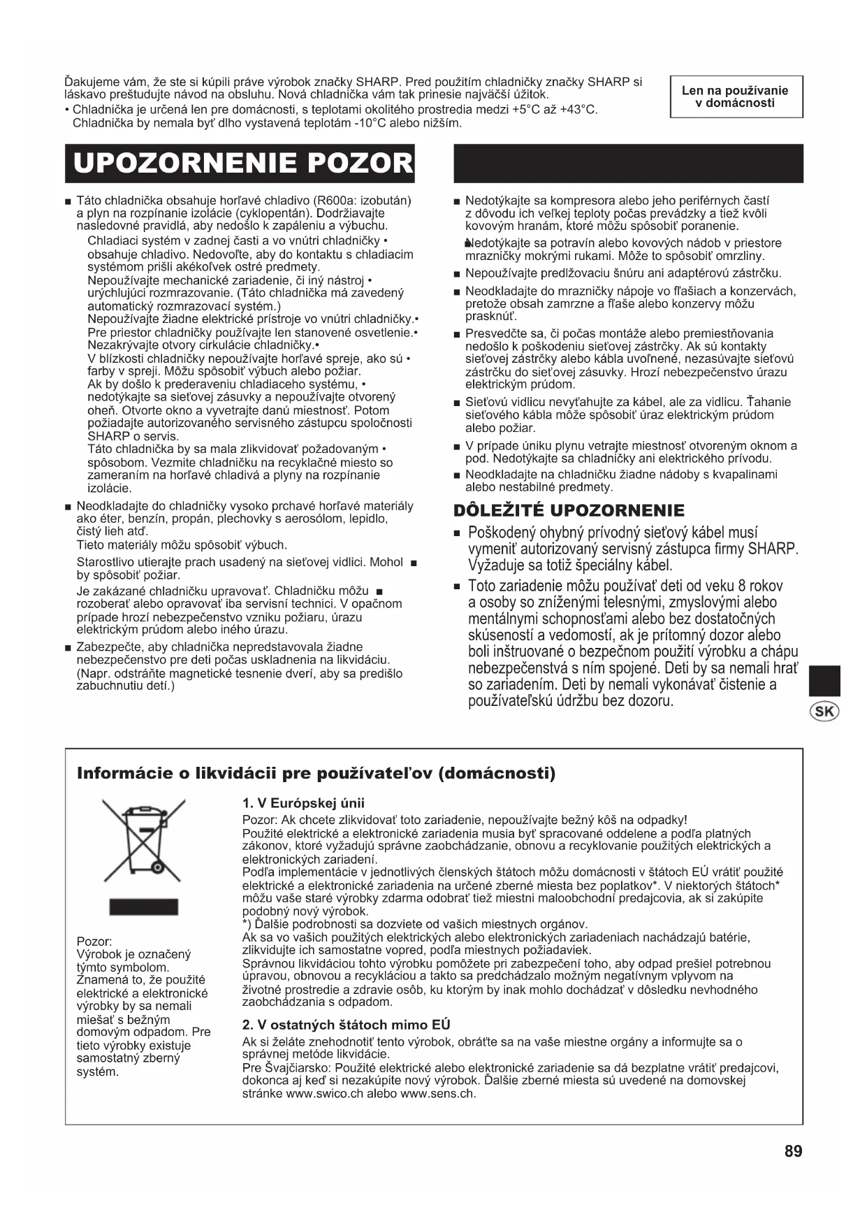 Ďakujeme vám, že ste si kúpili práve výrobok značky SHARP. Pred použitím chladničky značky SHARP si