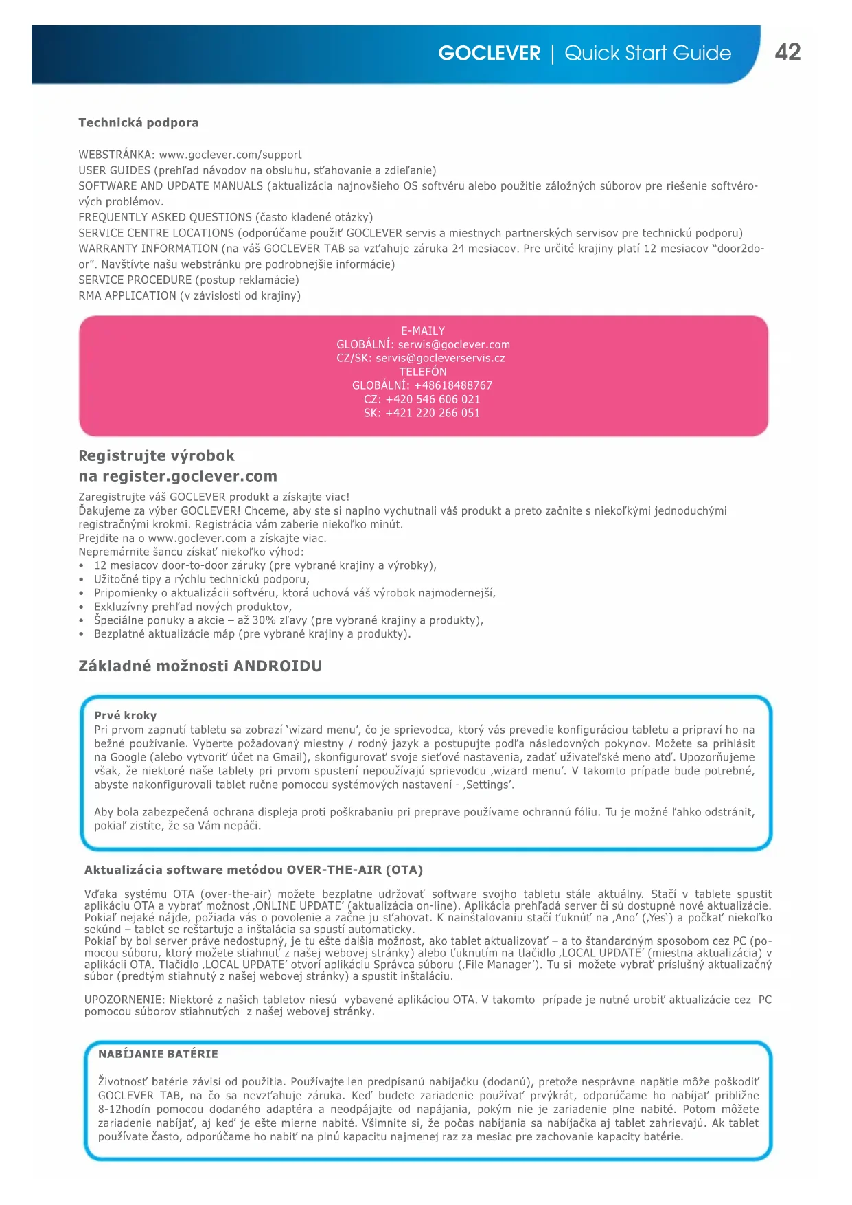Životnosť batérie závisí od použitia. Používajte len predpísanú nabíjačku (dodanú), pretože nesprávne napätie môže poškodiť GOCLEVER TAB, na čo sa nevzťahuje záruka. Keď budete zariadenie používať prvýkrát, odporúčame ho nabíjať približne 8-12hodín pomocou dodaného adaptéra a neodpájajte od napájania, pokým nie je zariadenie plne nabité. Potom môžete zariadenie nabíjať, aj keď je ešte mierne nabité. Všimnite si, že počas nabíjania sa nabíjačka aj tablet zahrievajú. Ak tablet používate často, odporúčame ho nabiť na plnú kapacitu najmenej raz za mesiac pre zachovanie kapacity batérie. Aktualizácia software metódou OVER-THE-AIR (OTA) Vďaka systému OTA (over-the-air) možete bezplatne udržovať software svojho tabletu stále aktuálny. Stačí v tablete spustit aplikáciu OTA a vybrať možnost ‚ONLINE UPDATE’ (aktualizácia on-line). Aplikácia prehľadá server či sú dostupné nové aktualizácie. Pokiaľ nejaké nájde, požiada vás o povolenie a začne ju sťahovat. K nainštalovaniu stačí ťuknúť na ‚Ano’ (‚Yes‘) a počkať niekoľko sekúnd – tablet se reštartuje a inštalácia sa spustí automaticky. Pokiaľ by bol server práve nedostupný, je tu ešte dalšia možnost, ako tablet aktualizovať – a to štandardným sposobom cez PC (po- mocou súboru, ktorý možete stiahnuť z našej webovej stránky) alebo ťuknutím na tlačidlo ‚LOCAL UPDATE’ (miestna aktualizácia) v aplikácii OTA. Tlačidlo ‚LOCAL UPDATE’ otvorí aplikáciu Správca súboru (‚File Manager’). Tu si možete vybrať príslušný aktualizačný súbor (predtým stiahnutý z našej webovej stránky) a spustit inštaláciu. UPOZORNENIE: Niektoré z našich tabletov niesú vybavené aplikáciou OTA. V takomto prípade je nutné urobiť aktualizácie cez PC pomocou súborov stiahnutých z našej webovej stránky.43 GOCLEVER | Quick Start Guide