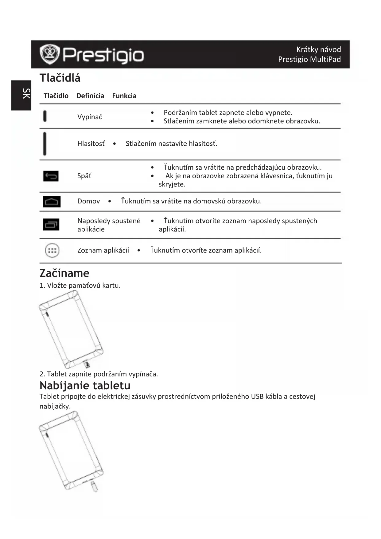 - Ťuknutímotvorítezoznamnaposledyspustených aplikácií. Zoznamaplikácií • Ťuknutímotvorítezoznamaplikácií. Začíname 1.Vložtepamäťovúkartu. 2.Tabletzapnitepodržanímvypínača. Nabíjanie tabletu TabletpripojtedoelektrickejzásuvkyprostredníctvompriloženéhoUSBkáblaacestovej nabíjačky.SK Krátky návod Prestigio MultiPad Domovská obrazovka Domovskáobrazovkaještartovacíbod,zktoréhomôžetepristupovaťkuvšetkýmfunkciám tabletu.Domovskáobrazovkamôžebyťrozdelenánaviaceropanelov.Akchcetezobraziť ostatnépanely,potiahniteprstomdoľavaalebodoprava. Pridanie ikony aplikácie na domovskú obrazovku Nadomovskejobrazovkeťuknitenaikonu .Otvorísazoznamaplikácií.Ťuknitenaikonu požadovanejaplikácie,podržtejuanáslednepresuňtenapožadovanýpanel. Nastavenie tapety 1.Ťuknitenaprázdnemiestonadomovskejobrazovkeapodržtenaňomprst. 2.Vybertejednuznasledujúcichmožností:Galéria, Živé tapety aleboTapety. 3.VyberteobrázokaťuknitenapoložkuNastaviť tapetu.Alebovyberteobrázok,ťahanímza okrajrámuupravtejehoveľkosťaťuknitenapoložkuOK. Používanie aplikácií Otvorenie aplikácie