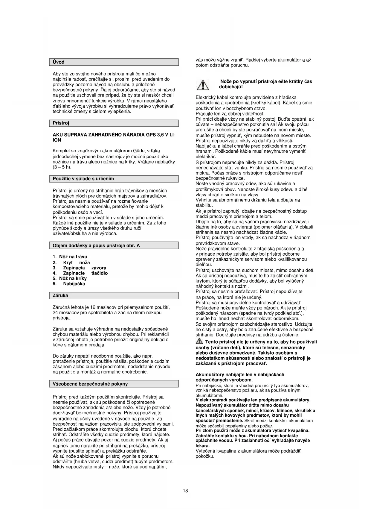 Záruka Záručná lehota je 12 mesiacov pri priemyselnom použití, 24 mesiacov pre spotrebiteľa a začína dňom nákupu prístroja. Záruka sa vzťahuje výhradne na nedostatky spôsobené chybou materiálu alebo výrobnou chybou. Pri reklamácii v záručnej lehote je potrebné priložiť originálny doklad o kúpe s dátumom predaja. Do záruky nepatrí neodborné použitie, ako napr. preťaženie prístroja, použitie násilia, poškodenie cudzím zásahom alebo cudzími predmetmi, nedodržanie návodu na použitie a montáž a normálne opotrebenie. Všeobecné bezpečnostné pokyny Prístroj pred každým použitím skontrolujte. Prístroj sa nesmie používať, ak sú poškodené či opotrebené bezpečnostné zariadenia a/alebo nože. Vždy je potrebné dodržiavať bezpečnostné pokyny. Prístroj používajte výhradne na účely uvedené v návode na použitie. Za bezpečnosť na vašom pracovisku ste zodpovední vy sami. Pred začiatkom práce skontrolujte plochu, ktorú chcete strihať. Odstráňte všetky cudzie predmety, ktoré nájdete. Aj počas práce dávajte pozor na cudzie predmety. Ak aj napriek tomu narazíte pri strihaní na prekážku, prístroj vypnite (pustite spínač) a prekážku odstráňte. Ak sú nože zablokované, prístroj vypnite a poruchu odstráňte (hrubá vetva, cudzí predmet) tupým predmetom. Nikdy nepoužívajte prsty – nože, ktoré sú pod napätím, vás môžu vážne zraniť. Radšej vyberte akumulátor a až potom odstráňte poruchu.