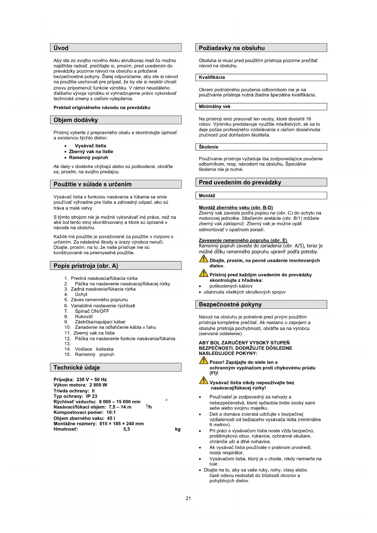 Povolené přípojky na motoru Zkontrolujte zapojení do sítě a jištění Nechte zkontrolovat a příp. vyměnit v zákaznickém servisu. Sběrný vak montáž tak, aby koncový spínač je aktivován. Nechte zkontrolovat a příp. opravit v zákaznickém servisu. Přístroj nesaje Plný sběrný vak Ucpaná sací trubka Přepínač v poloze „Foukání“ Vysypte sběrný vak Vyčistěte sací trubku Přepněte na „Sání“ Přístroj nefouká Přepínač v poloze „Sání“ Přepněte na „Foukání“. 20Úvod Aby ste zo svojho nového Akku skrutkovac mali čo možno najdlhšie radosť, prečítajte si, prosím, pred uvedením do prevádzky pozorne návod na obsluhu a priložené bezpečnostné pokyny. Ďalej odporúčame, aby ste si návod na použitie uschovali pre prípad, že by ste si neskôr chceli znovu pripomenúť funkcie výrobku. V rámci neustáleho ďalšieho vývoja výrobku si vyhradzujeme právo vykonávať technické zmeny s cieľom vylepšenia. Preklad originálneho návodu na prevádzku Objem dodávky Prístroj vyberte z prepravného obalu a skontrolujte úplnosť a existenciu týchto dielov: Vysávač lístia Zberný vak na lístie Ramenný popruh Ak diely v dodávke chýbajú alebo sú poškodené, obráťte sa, prosím, na svojho predajcu. Použitie v súlade s určením Vysávač lístia s funkciou nasávania a fúkania sa smie používať výhradne pre lístie a záhradný odpad, ako sú tráva a malé vetvy. S týmto strojom nie je možné vykonávať iné práce, než na aké bol tento stroj skonštruovaný a ktoré sú opísané v návode na obsluhu. Každé iné použitie je považované za použitie v rozpore s určením. Za následné škody a úrazy výrobca neručí. Dbajte, prosím, na to, že naše prístroje nie sú konštruované na priemyselné použitie. Popis prístroja (obr. A)