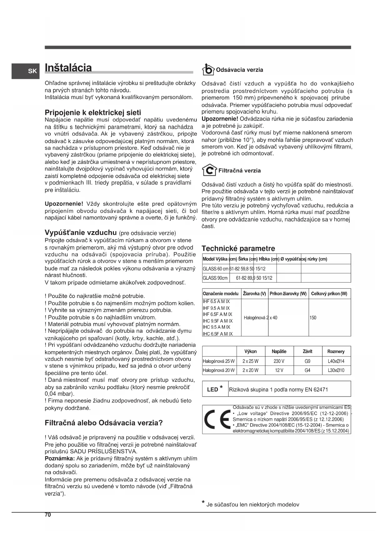Technické parametre Model Výška (cm) Šírka (cm) Hĺbka (cm) Ø vypúšťacej rúrky (cm)GLASS 60 cm 61-82 59,8 50 15/12GLASS 90cm 61-82 89,9 50 15/12 Označenie modelu Žiarovka (V) Príkon žiarovky (W) Celkový príkon (W) IHF 6.5 A M IXIHF 9.5 A M IXIHF 6.5F A M IXIHC 9.5F A M IXIHC 9.5 A M IXIHC 6.5F A M IXHalogénová 2 x 40 150 Výkon Napätie Závit Rozmery
