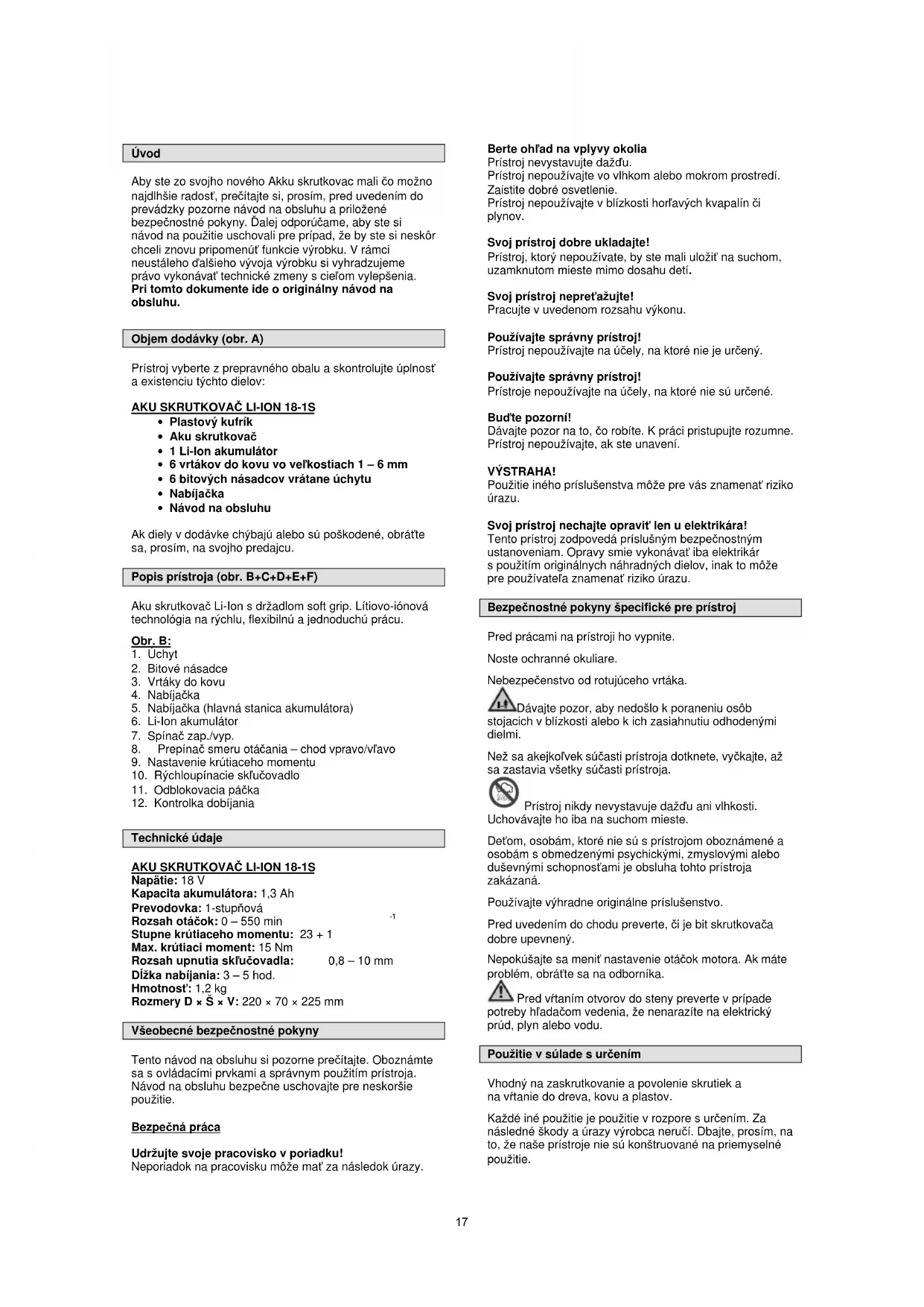 Stupne krútiaceho momentu: 23 + 1 Max. krútiaci moment: 15 Nm Rozsah upnutia skľučovadla: 0,8 – 10 mm Dĺžka nabíjania: 3 – 5 hod. Hmotnosť: 1,2 kg Rozmery D × Š × V: 220 × 70 × 225 mm Všeobecné bezpečnostné pokyny Tento návod na obsluhu si pozorne prečítajte. Oboznámte sa s ovládacími prvkami a správnym použitím prístroja. Návod na obsluhu bezpečne uschovajte pre neskoršie použitie. Bezpečná práca Udržujte svoje pracovisko v poriadku! Neporiadok na pracovisku môže mať za následok úrazy. Berte ohľad na vplyvy okolia Prístroj nevystavujte dažďu. Prístroj nepoužívajte vo vlhkom alebo mokrom prostredí. Zaistite dobré osvetlenie. Prístroj nepoužívajte v blízkosti horľavých kvapalín či plynov. Svoj prístroj dobre ukladajte! Prístroj, ktorý nepoužívate, by ste mali uložiť na suchom, uzamknutom mieste mimo dosahu detí. Svoj prístroj nepreťažujte! Pracujte v uvedenom rozsahu výkonu. Používajte správny prístroj! Prístroj nepoužívajte na účely, na ktoré nie je určený. Používajte správny prístroj! Prístroje nepoužívajte na účely, na ktoré nie sú určené. Buďte pozorní! Dávajte pozor na to, čo robíte. K práci pristupujte rozumne. Prístroj nepoužívajte, ak ste unavení. VÝSTRAHA! Použitie iného príslušenstva môže pre vás znamenať riziko úrazu. Svoj prístroj nechajte opraviť len u elektrikára! Tento prístroj zodpovedá príslušným bezpečnostným ustanoveniam. Opravy smie vykonávať iba elektrikár s použitím originálnych náhradných dielov, inak to môže pre používateľa znamenať riziko úrazu. Bezpečnostné pokyny špecifické pre prístroj Pred prácami na prístroji ho vypnite. Noste ochranné okuliare. Nebezpečenstvo od rotujúceho vrtáka. Dávajte pozor, aby nedošlo k poraneniu osôb stojacich v blízkosti alebo k ich zasiahnutiu odhodenými dielmi. Než sa akejkoľvek súčasti prístroja dotknete, vyčkajte, až sa zastavia všetky súčasti prístroja. Prístroj nikdy nevystavuje dažďu ani vlhkosti. Uchovávajte ho iba na suchom mieste. Deťom, osobám, ktoré nie sú s prístrojom oboznámené a osobám s obmedzenými psychickými, zmyslovými alebo duševnými schopnosťami je obsluha tohto prístroja zakázaná. Používajte výhradne originálne príslušenstvo. Pred uvedením do chodu preverte, či je bit skrutkovača dobre upevnený. Nepokúšajte sa meniť nastavenie otáčok motora. Ak máte problém, obráťte sa na odborníka. Pred vŕtaním otvorov do steny preverte v prípade potreby hľadačom vedenia, že nenarazíte na elektrický prúd, plyn alebo vodu. Použitie v súlade s určením Vhodný na zaskrutkovanie a povolenie skrutiek a na vŕtanie do dreva, kovu a plastov. Každé iné použitie je použitie v rozpore s určením. Za následné škody a úrazy výrobca neručí. Dbajte, prosím, na to, že naše prístroje nie sú konštruované na priemyselné použitie. 17Pred uvedením do chodu Akumulátor sa dodáva len čiastočne nabitý. Pred prvým uvedením do chodu je nutné ho plne nabiť. POZOR:
